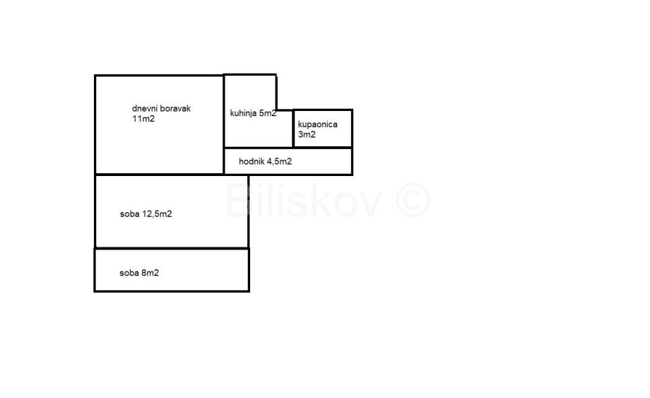 Sastoji se od kuhinje, dnevnog boravka s blagovaonicom, veće spavaće sobe kroz koju se ulazi u manju i kupaonice.