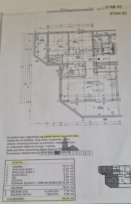 Netto površina zatvorenog dijela stana je 78,47 m2, a obračunska površina je 89,55 m2.