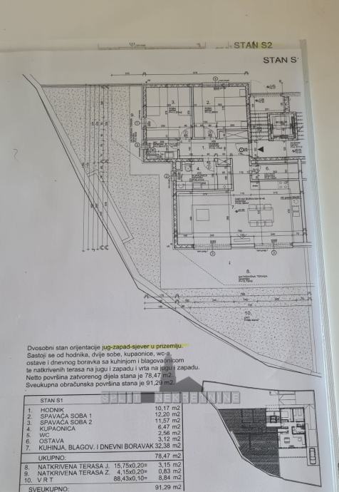Netto površina zatvorenog dijela stana je 78,47 m2, a a obračunska površina iznosi 91,29 m2.