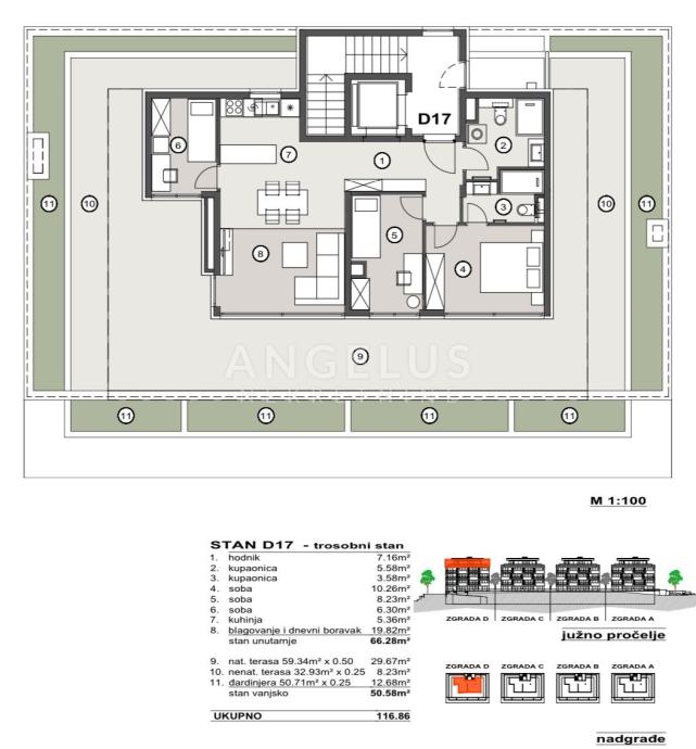 Prodaje se trosoban stan u novogradnji ukupne neto površine od 116.86 m2, sa prostranom terasom, položen na nadgrađu stambene zgrade, J-Z-I-S orijentacije. Stan se sastoji od ulaznog hodnika, kuhinje i blagovaonice s dnevnim boravkom, tri spavaće sobe, dvije kupaonice, velike natkrivene i nenatkrivene terase s žardinjerama (ukupne bruto površine 142 m2). Zgrada lijepe arhitekture i visoke energetske učinkovitosti gradi se prema suvremenim standardima od vrlo kvalitetnih materijala sa svom potrebnom opremom. Zgrada ima dvije podrumske garaže sa parkirnim mjestima, prizemlje, tri kata i nadgrađe. Predviđen je jedan ulaz s liftom koji povezuje sve etaže. Cijena parkirnog mjesta u podrumskoj etaži iznosi 2.000 eur po m2. Zgrada zbog svoje orijentacije je osunčana cijeli dan i ima prekrasan otvoreni pogled.