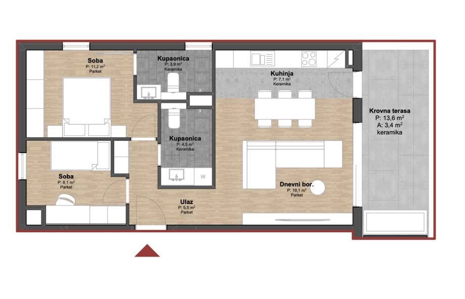Split - Podstrana | Stambena zgrada s devet modernih stambenih jedinica - drugi red od mora.Na prodaju je atraktivna stambena zgrada s ukupno devet stambenih jedinica, smještena na iznimno poželjnoj lokaciji u drugom redu od mora u Podstrani.Projekt je osmišljen i bit će izveden prema najvišim građevinskim standardima, uz pažljivo birane materijale i suvremena tehnička rješenja koja osiguravaju udobnost, sigurnost i visoku kvalitetu stanovanja.Iznimna lokacija omogućuje da svaki stan i svaka etaža uživaju u otvorenom i trajno nesmetanom pogledu na more.B - S1 | Dvosoban stan na prvom katuStan se sastoji od ulaznog hodnika, dvije spavaće sobe ( od kojih jedna s pripadajućom kupaonicom ), kupaonice, kuhinje s blagovaonicom i dnevnog boravka. Stambena površina iznosi 53, 99 m².Dnevni boravak ima izlaz na natkriveni balkon površine 19, 11 m².Ukupna neto površina stana s garažnim mjestom iznosi 69, 87 m².U cijenu je uključeno jedno garažno parkirno mjesto, te postoji mogućnost kupnje dodatnog parkirnog garažnog mjesto po cijeni od 30 000 eura.Mikrolokacija je iznimna - svega nekoliko koraka do mora, uređenih plaža i nove šetnice koja povezuje cijelu Podstranu, kao i blizina svih potrebnih sadržaja (javni prijevoz, trgovine, restorani, kafići i dr.).Za sve dodatne informacije stojimo Vam na raspolaganju....