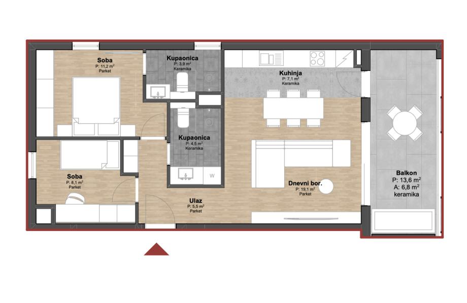 Split - Podstrana | Stambena zgrada s devet modernih stambenih jedinica - drugi red od mora.Na prodaju je atraktivna stambena zgrada s ukupno devet stambenih jedinica, smještena na iznimno poželjnoj lokaciji u drugom redu od mora u Podstrani.Projekt je osmišljen i bit će izveden prema najvišim građevinskim standardima, uz pažljivo birane materijale i suvremena tehnička rješenja koja osiguravaju udobnost, sigurnost i visoku kvalitetu stanovanja.Iznimna lokacija omogućuje da svaki stan i svaka etaža uživaju u otvorenom i trajno nesmetanom pogledu na more.B - S7 | Dvosoban stan na trećem katuStan se sastoji od ulaznog hodnika, dvije spavaće sobe ( od kojih jedna s pripadajućom kupaonicom ), kupaonice, kuhinje s blagovaonicom i dnevnog boravka. Stambena površina iznosi 59, 46 m².Dnevni boravak ima izlaz na natkriveni balkon površine 13, 64 m².Ukupna neto površina stana s garažnim mjestom iznosi 73, 28 m².U cijenu je uključeno jedno garažno mjesto, te postoji mogućnost kupnje dodatnog garažnog parkirnog mjesta po cijeni od 30 000, 00 EUR-a.Mikrolokacija je iznimna - svega nekoliko koraka do mora, uređenih plaža i nove šetnice koja povezuje cijelu Podstranu, kao i blizina svih potrebnih sadržaja (javni prijevoz, trgovine, restorani, kafići i dr.).Za sve dodatne informacije stojimo Vam na raspolaganju....