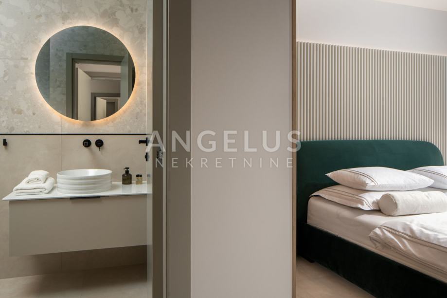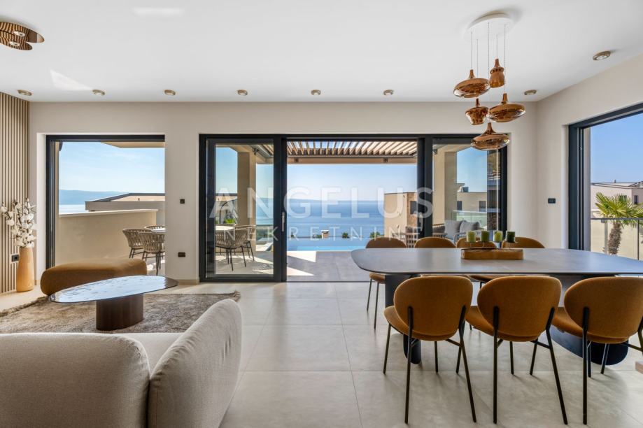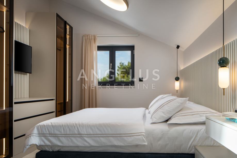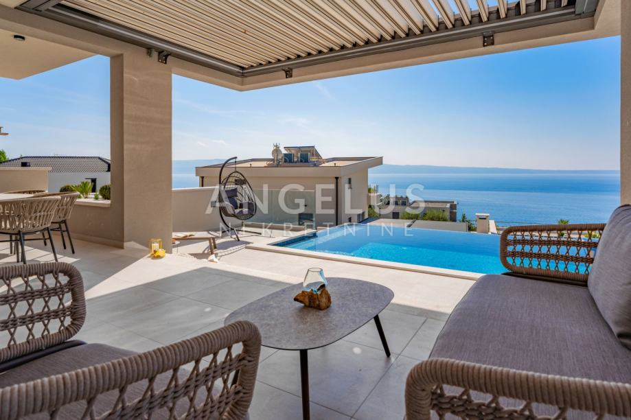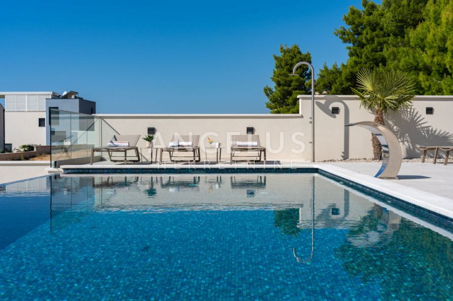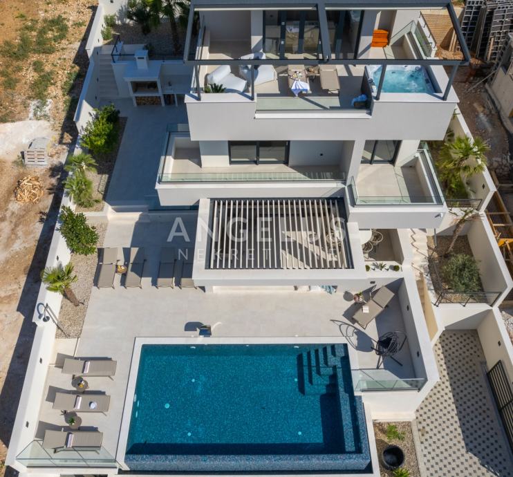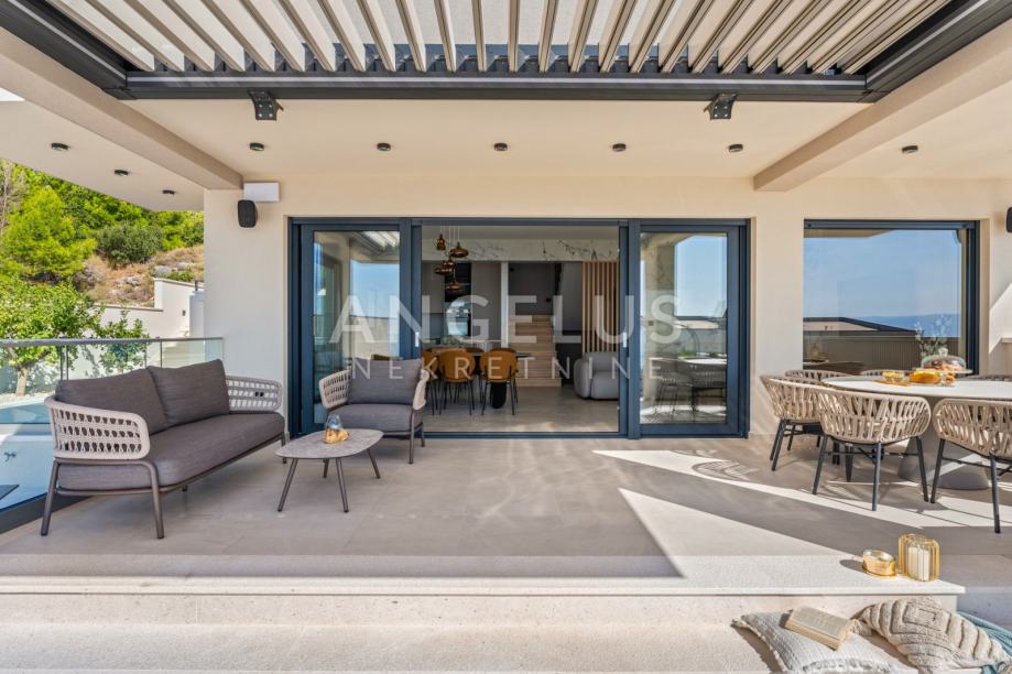 Ova luksuzna vila nudi 5 prostranih spavaćih soba, od kojih svaka ima svoju kupaonicu. Dnevni boravak je otvorenog tipa, spojen s modernom kuhinjom i blagovaonicom koja izlazi na predivnu terasu. Terasa je opremljena preljevnim bazenom, bioklimatskom pergolom, sunčalištem i uređenom okućnicom sa mediteranskim raslinjem tipičnim za ovo podneblje što čini ovu vilu idealnim mjestom za opuštanje i uživanje.
