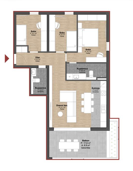 Split - Podstrana | Stambena zgrada s devet modernih stambenih jedinica - drugi red od mora.Na prodaju je atraktivna stambena zgrada s ukupno devet stambenih jedinica, smještena na iznimno poželjnoj lokaciji u drugom redu od mora u Podstrani.Projekt je osmišljen i bit će izveden prema najvišim građevinskim standardima, uz pažljivo birane materijale i suvremena tehnička rješenja koja osiguravaju udobnost, sigurnost i visoku kvalitetu stanovanja.Iznimna lokacija omogućuje da svaki stan i svaka etaža uživaju u otvorenom i trajno nesmetanom pogledu na more.A - S7 | Trosoban penthouseStan se sastoji od ulaznog hodnika, tri spavaće sobe ( od kojih jedna s pripadajućom kupaonicom ), zajedničke kupaonice, kuhinje s blagovaonicom i dnevnog boravka. Stambena površina iznosi 78, 35 m².Dnevni boravak ima izlaz na natkriveni balkon površine 17, 79 m².Ukupna neto površina stana s garažnim mjestima iznosi 102, 25 m².U cijenu su uključena dva garažna parkirna mjesta.Mikrolokacija je iznimna - svega nekoliko koraka do mora, uređenih plaža i nove šetnice koja povezuje cijelu Podstranu, kao i blizina svih potrebnih sadržaja (javni prijevoz, trgovine, restorani, kafići i dr.).Za sve dodatne informacije stojimo Vam na raspolaganju....