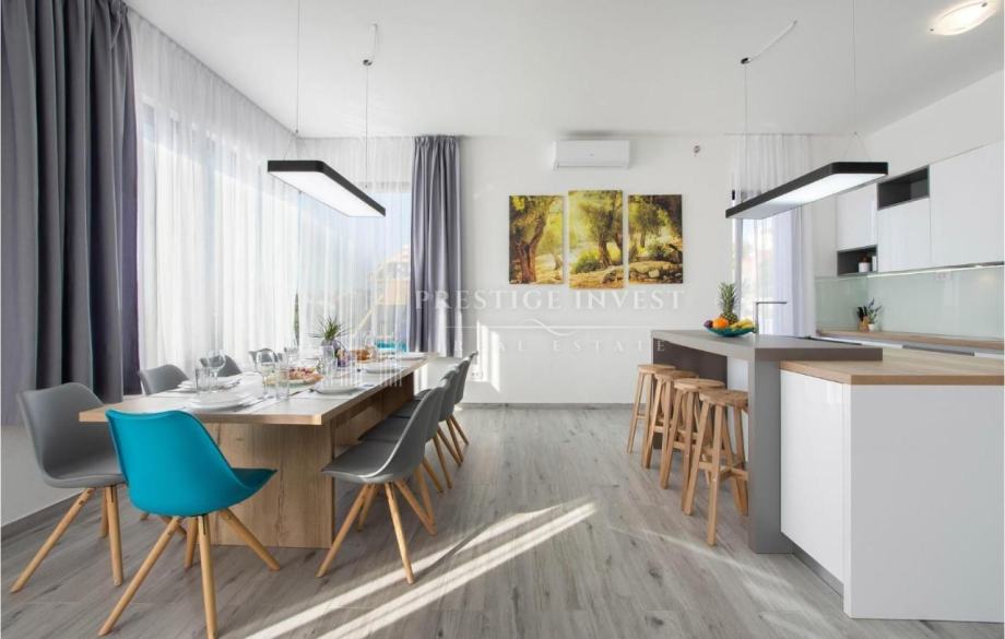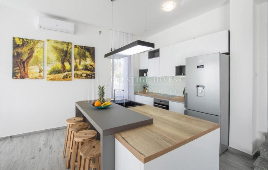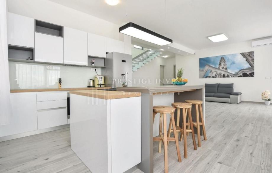 Vile se prostire na dvije etaže, prizemlje i prvi kat. Na prvom katu se nalazi dnevni boravak s blagovaonicom i izlazom na vrt s bazenom dok stepenice vode na gornju etažu sa sobama i kupaonicom.