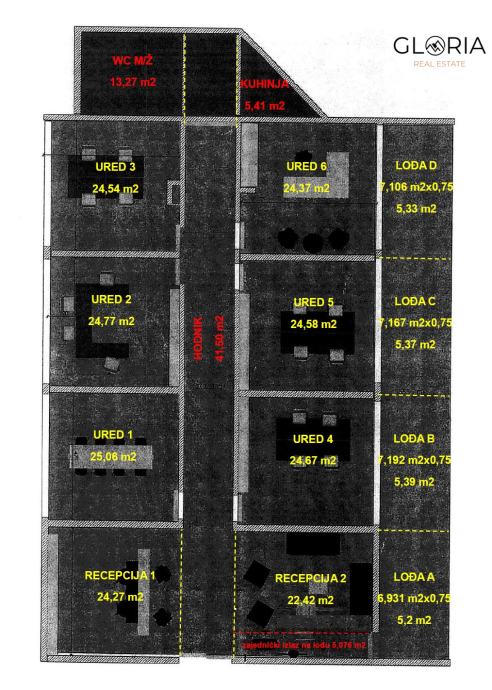 - recepcija (mogućnost prenamjene u ured) – 22,45 m²