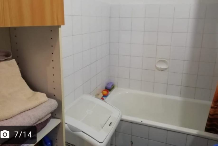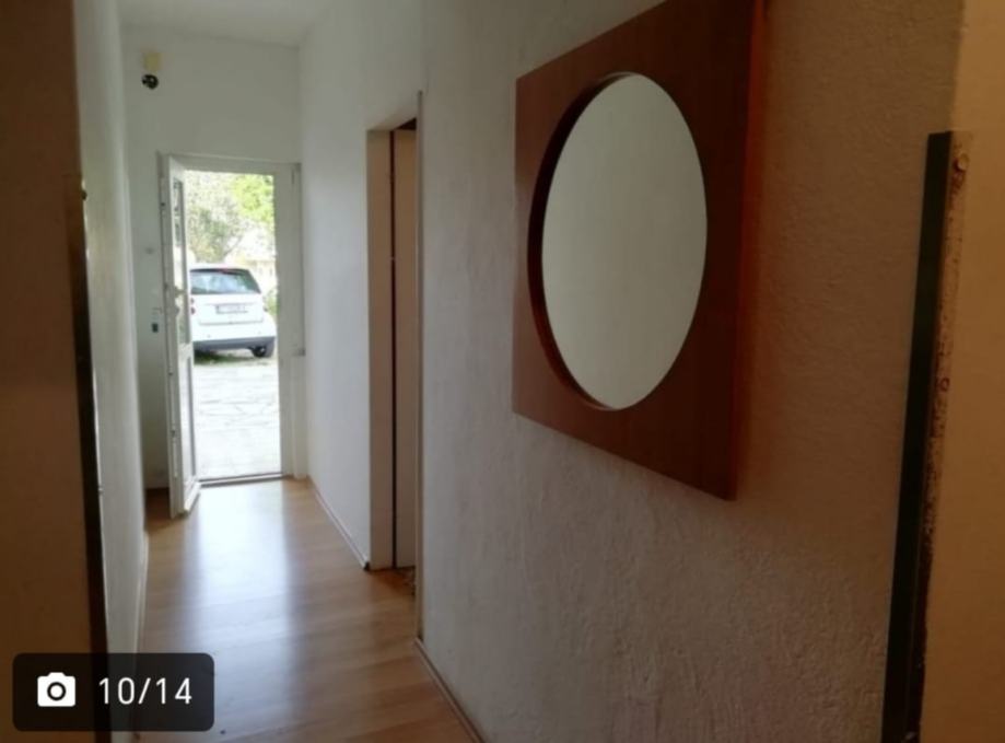 Dnevni boravak ima prozor s roletama prema van. Kuhinja je odvojena, s gornjim i donjim elementima te pločom za kuhanje. Hodnik je prostran, s lamitatom na podu koji se proteže i kroz ostale prostorije. Kupaonica s WC-om dolazi uz stan.