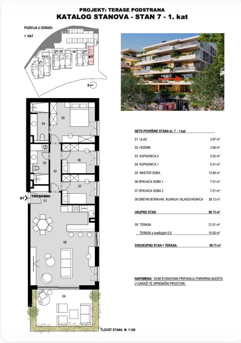 STAN 7- trosoban stan smješten na prvom katu zgrade, zatvorene površine 86, 73 m², kojem dodatnu vrijednost daje natkrivena terasa površine 21 m². Funkcionalan raspored prostora obuhvaća ulazni hodnik, tri spavaće sobe od kojih jedna ima pripadajuću kupaonicu, zajedničku kupaonicu, te dnevni boravak s blagovaonicom i kuhinjom otvorenog tlocrta s izlazom na terasu .