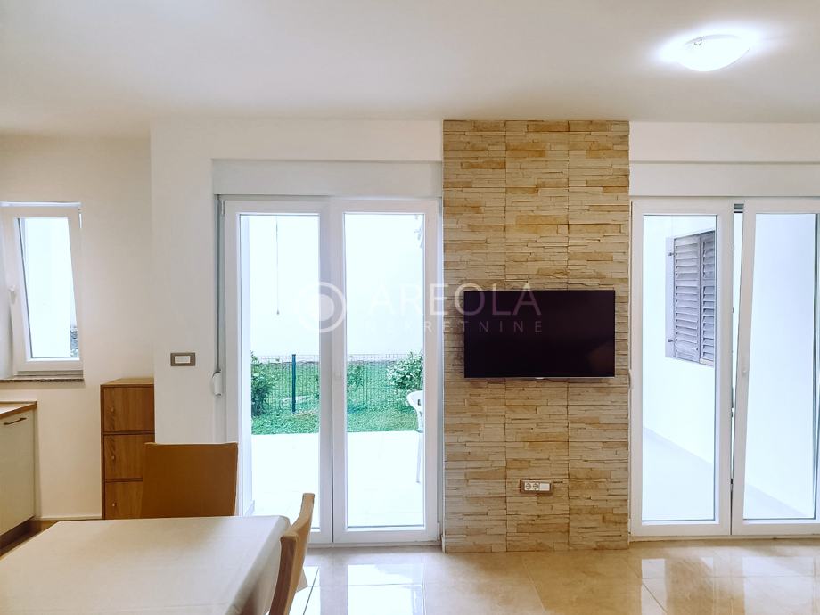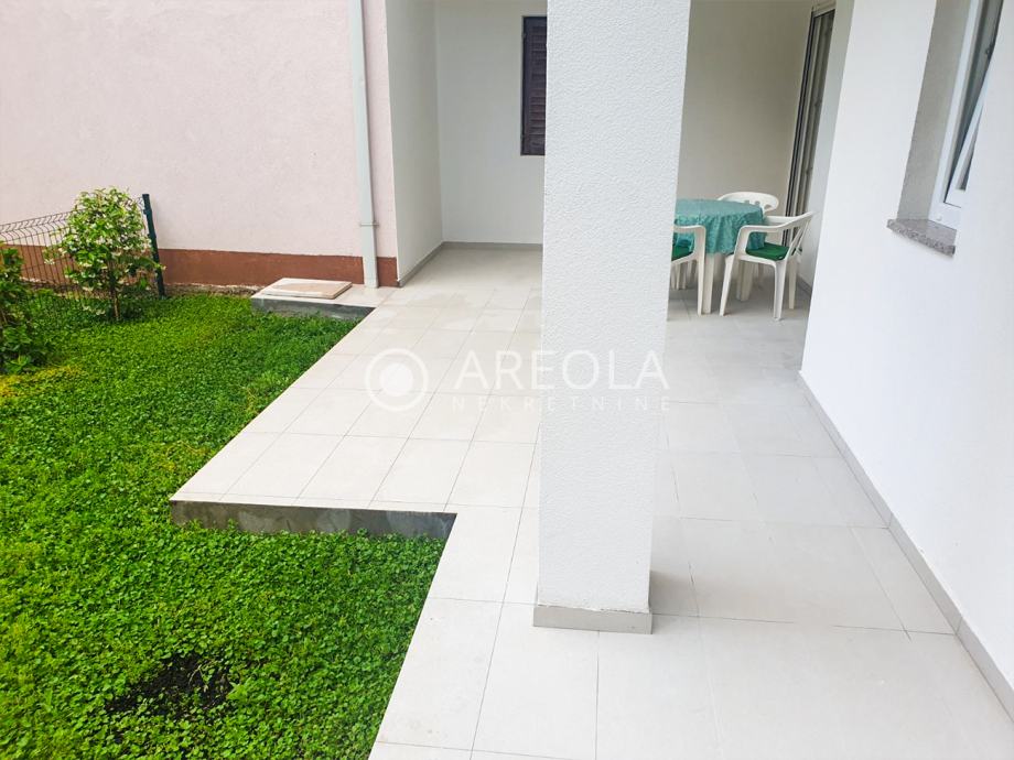 Sastoji se od kuhinje s blagavaonicom i dnevnim dijelom, spavaće sobe i kupaonice - stambene površine 50 m2. Ispred stana se nalazi uređen vrt s terasom za boravak na otvorenom i mogućnost roštiljanja - ukupne površine 40 m2.