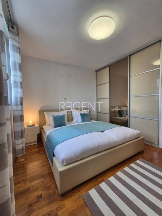 Dnevni boravak i blagovaonica smješteni su u otvorenom prostoru, a iz dnevnog dijela omogućen je izlaz na lođu s pogledom na more. Stan je potpuno namješten i klimatiziran, opremljen velikim prozorima koji omogućuju obilje prirodnog svjetla. Podovi su izvedeni od betonske deke, parketa i keramike, dok je vanjska stolarija izrađena od PVC materijala.