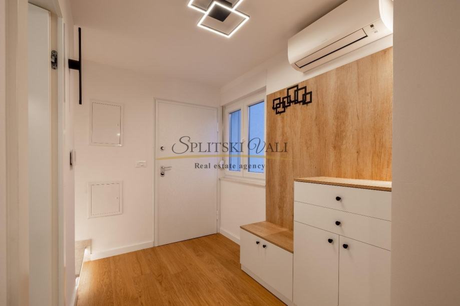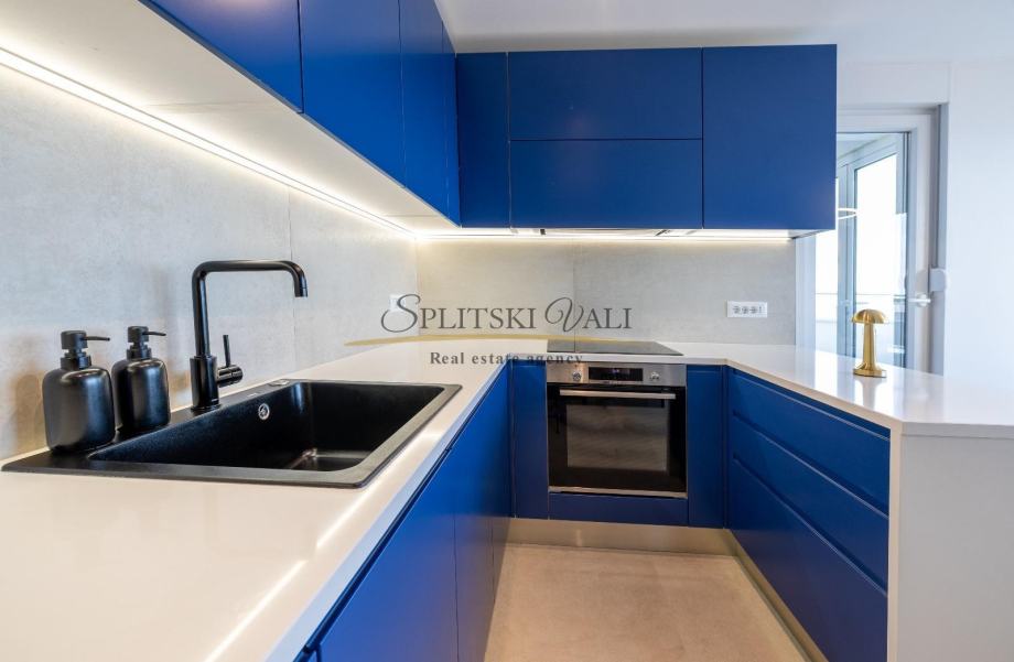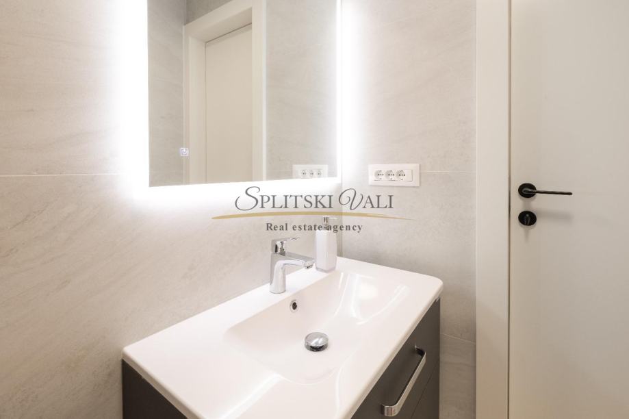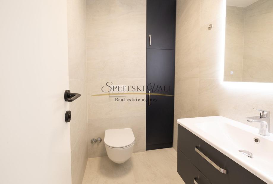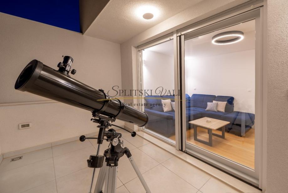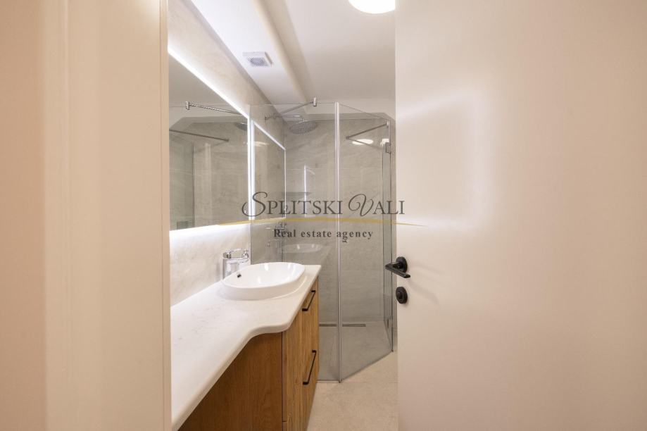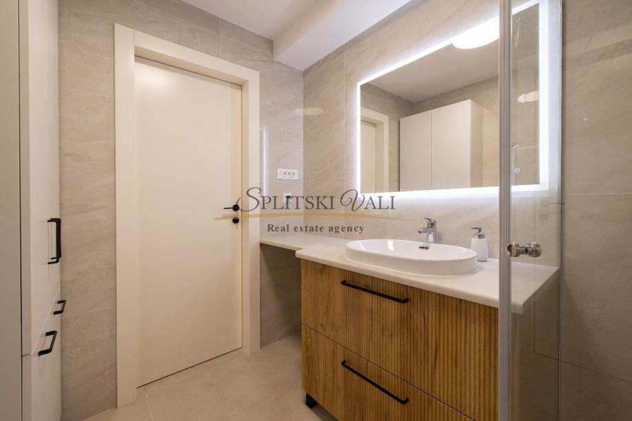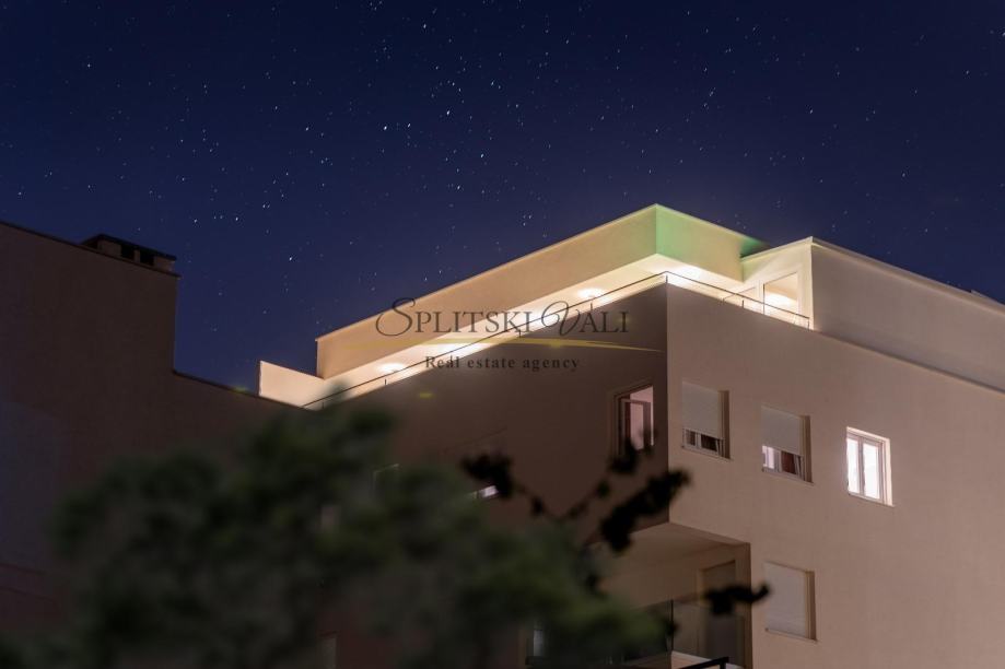 Stan ima odličan tlocrt, sastoji se od prostranog dnevnog baravka s blagovaonicom i moderne kuhinje, dvije spavaće sobe, walk-in ormara, kupaonice i zasebnog WC- te odvojene prostorije-vešeraj. Neto površina stana iznosi 67 m². Dodanu vrijednost stanu daje terasa (58m2 od koje je 22m2 natkriveno), koja pruža spektakularan pogled na more. Na terasi se nalazi jacuzzi, idealan za opuštanje u miru i privatnosti vlastitog doma.
