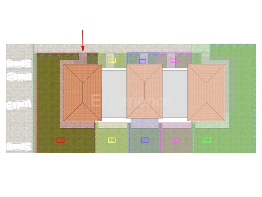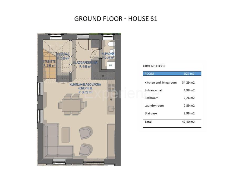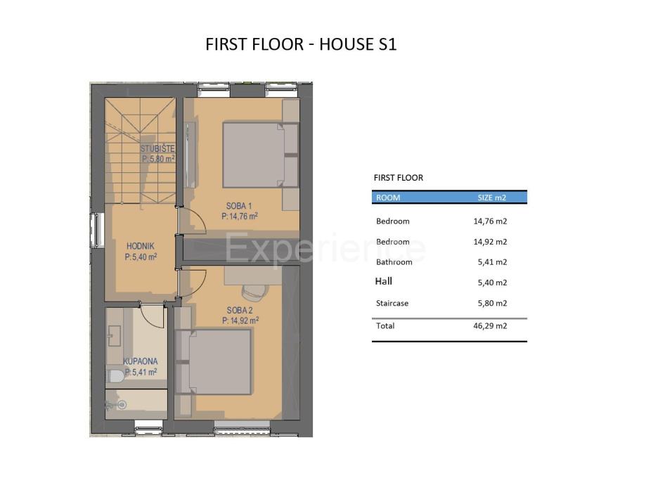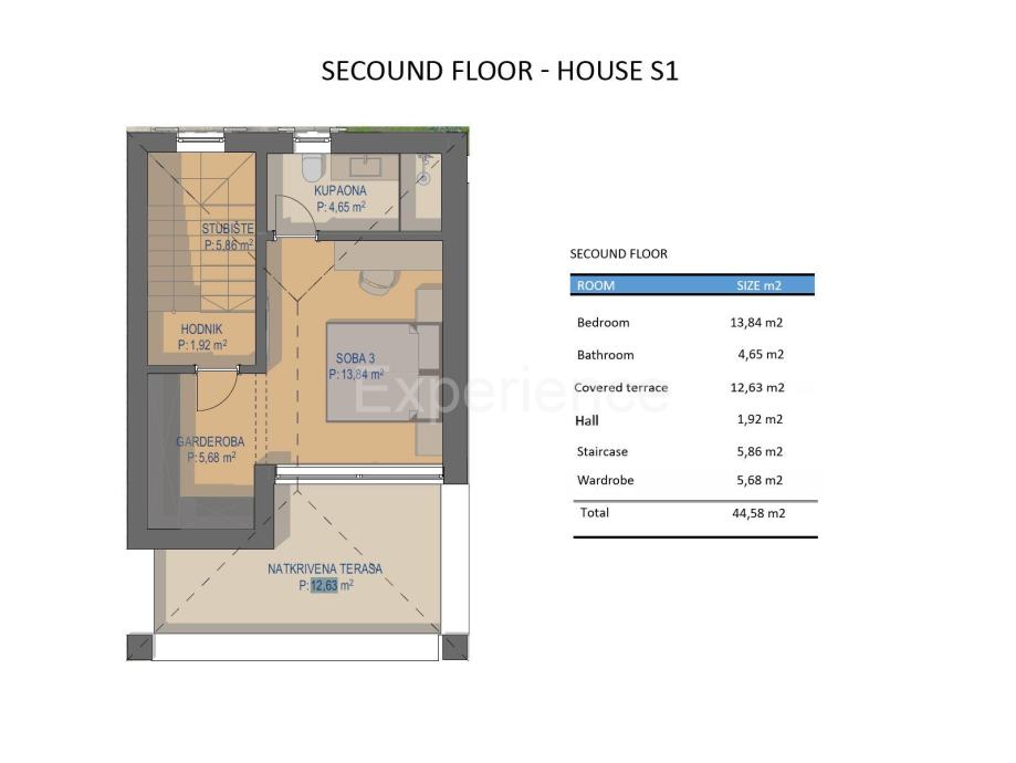Raspored prostorija:• Prizemlje: ulazni hodnik, otvoreni koncept dnevnog boravka, kuhinje i blagovaonice sa izlazom na terasu, gostinjski toalet i praonica,• Prvi kat: dvije prostrane spavaće sobe i moderna kupaonica,• Drugi kat: glavna spavaća soba s vlastitom kupaonicom, garderobom i izlazom na natkrivenu terasu (12,63 m²).