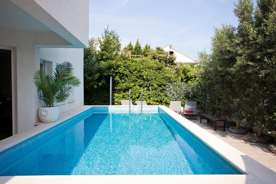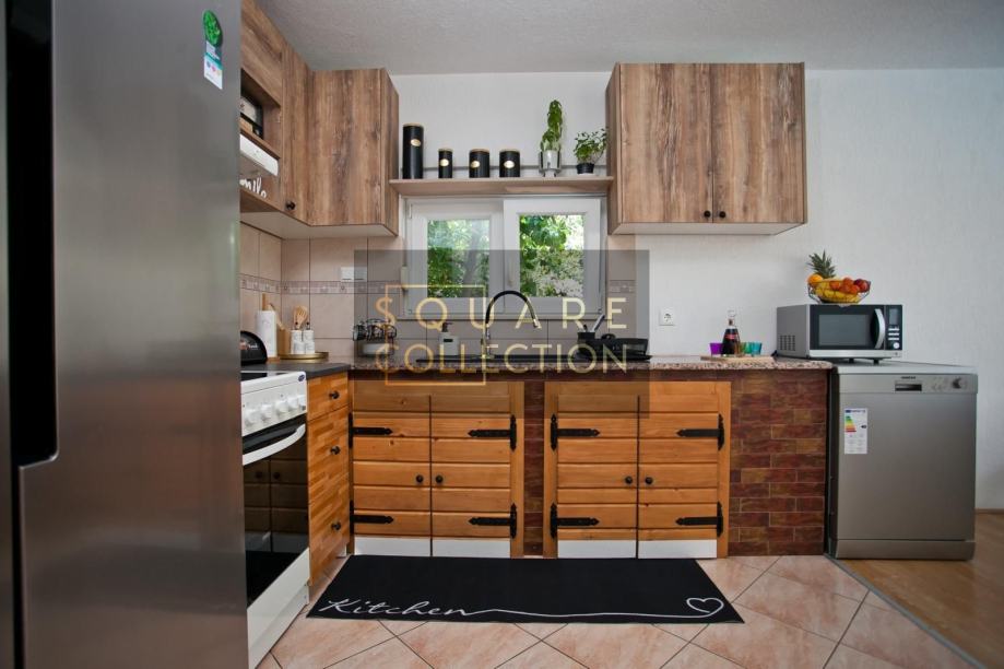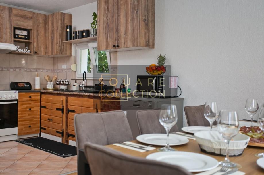 Kuhinja je posebna prostorija, potpuno opremljena svim aparatima i to ; dvostrukim frižiderom koji sadržava aparat za pravljenje leda, štednjakom na struju sa pećnicom, mikrovalnom, aparatom za kavu, perilicom rublja, te kuhalom za vodu.U kuhinji se također nalazi veliki stol sa stolicama i kutnom klupom.Iz prostranog dnevnog boravka se izlazi na terasu sa bazenom i ležaljkama.Oko kuće se smjestila okućnica sa slijedećim sadržajima: