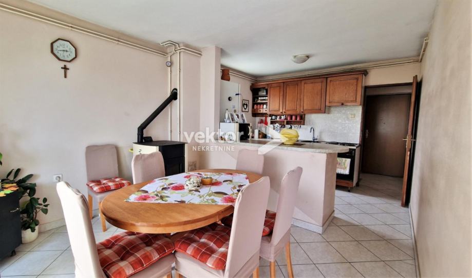 Na katu se nalazi trosoban stan s dnevnim boravkom, terasom i balkonom.