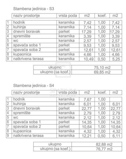 Predmetni stan, smješten je na 1. katu stambene zgrade te se sastoji od ulaznog hodnika (7,67m2), kuhinje (6,01m2), dnevnog boravka (22,77m2), spremišta (2,79m2), wc(2,12m2), dvije spavaće sobe (14,35m2 i 10,64m2), kupaonice (4,32m2), te natkrivene terase površine 12,21m2. Također stanu pripadaju 2 vanjska parkirna mjesta. Sve ukupno to čini površinu 76,77m2.