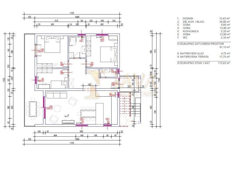 * Sastoji se od dnevnog boravka s kuhinjom i blagovaonicom, 3 spavaće sobe, kupaonice, toaleta, hodnika i terase