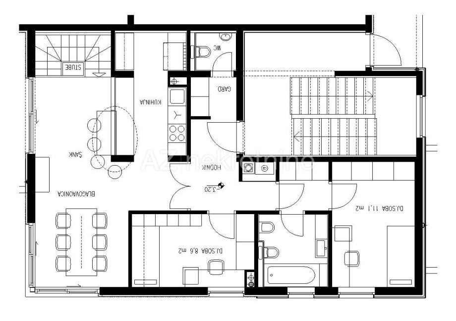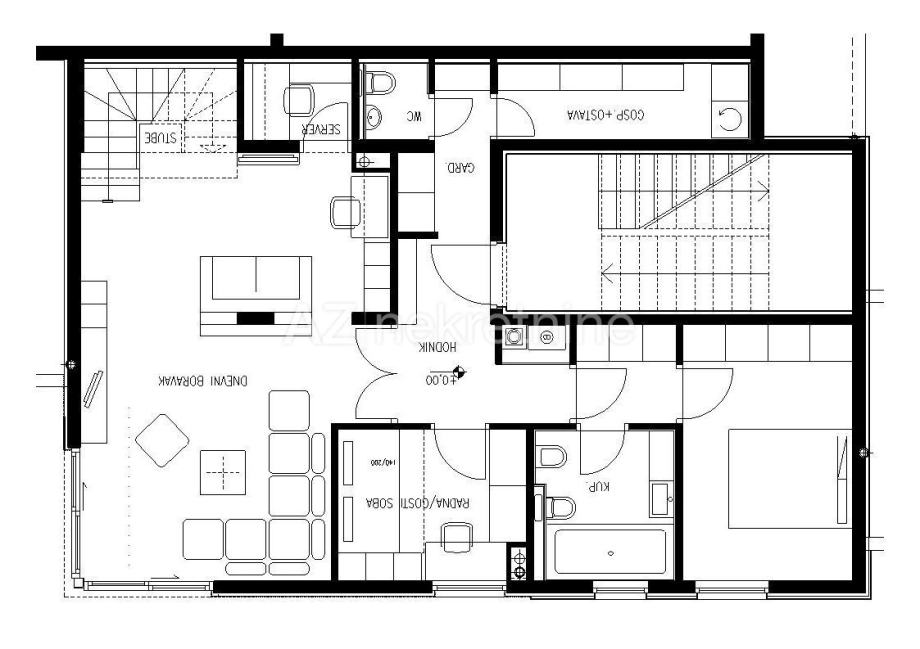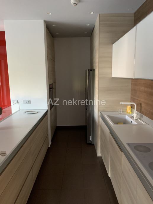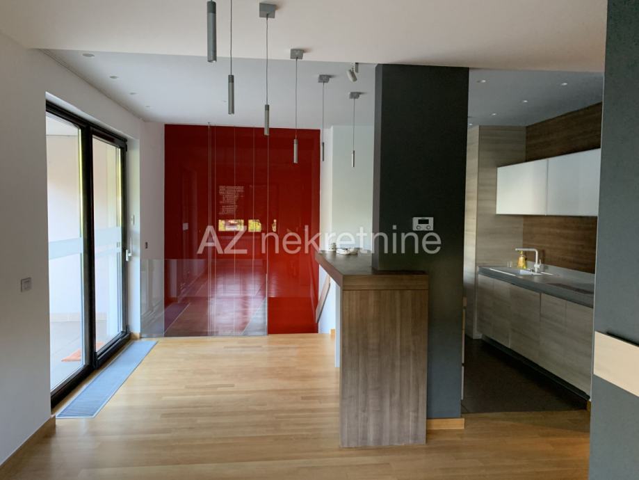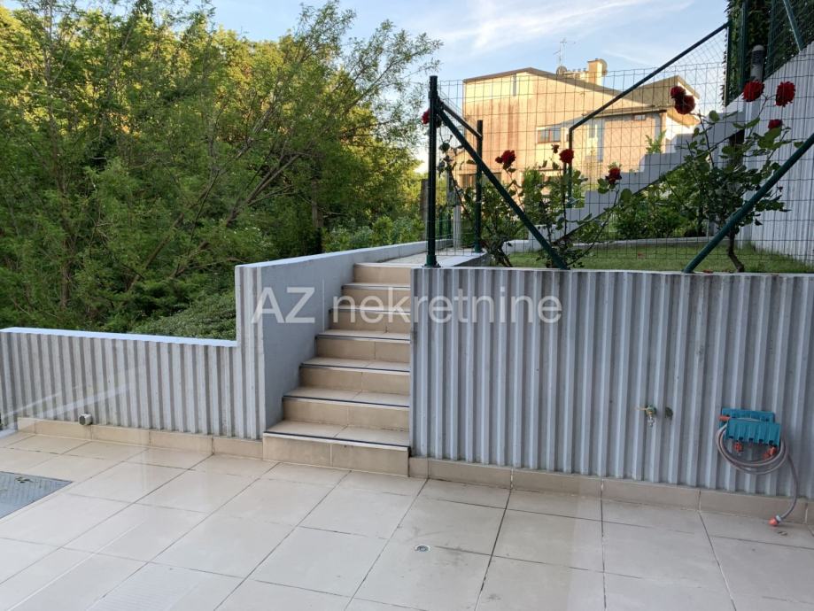 Stan se proteže kroz dvije etaže; na prvoj etaži nalazi se ulazni hodnik, dvije spavaće sobe, kupaonica, toalet, kuhinja s blagovaonicom iz kojih se izlazi na terasu i vrt, dok se u donjoj etaži nalazi dnevni boravak, spavaća soba s kupaonicom i toalet. Stan je vrlo svijetao i ugodan, trenutno je polunamješten s ugradbenim ormarima u hodnicima i spavaćim sobama, te kompletna kuhinja s aparatima. Za dugoročniji najam moguće je dogovoriti kompletno namještanje.
