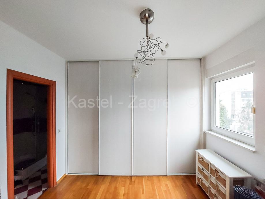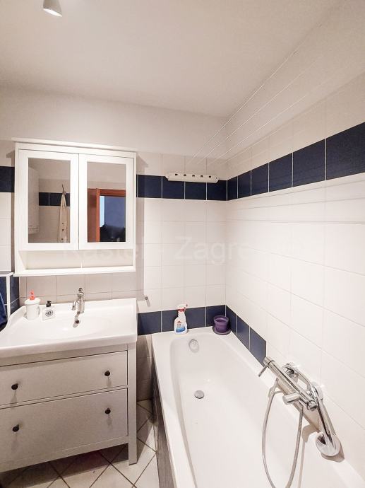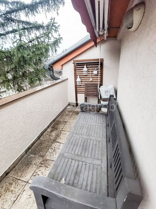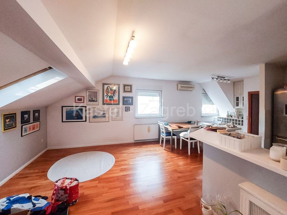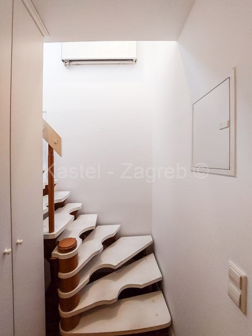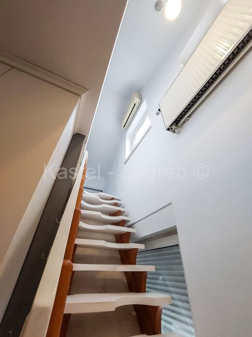 Donju etažu stana čine ulazni dio, kupaona, blagovaona s kuhinjom i dnevnim boravkom 40 m2, hodnik u kojem je radni stol, soba s kupaonom 17 m2 i izlazom na balkon 7 m2. Gornju etaža potkrovlje stana čine galerija koja je koncipirana kao manji boravak s radnim stolom 22 m2 i veća spavaća soba 28 m2.Navedene površine su podne površine. Stan je kompletno uređen 2007 godine: nove instalacije vode, grijanja, struje, plinski bojler, parket, krovni prozor i vanjska stolarija, klima uređaji. Zajednički vrt