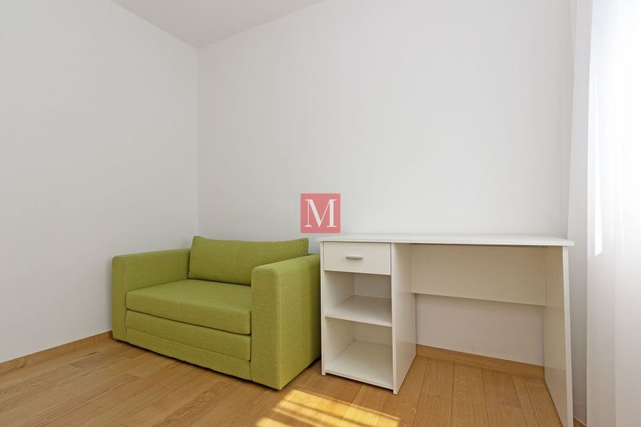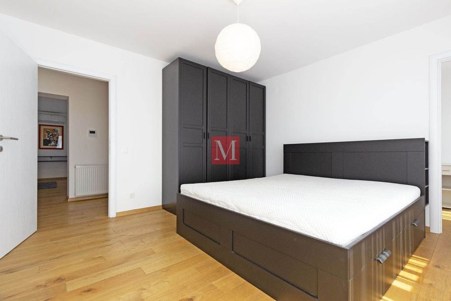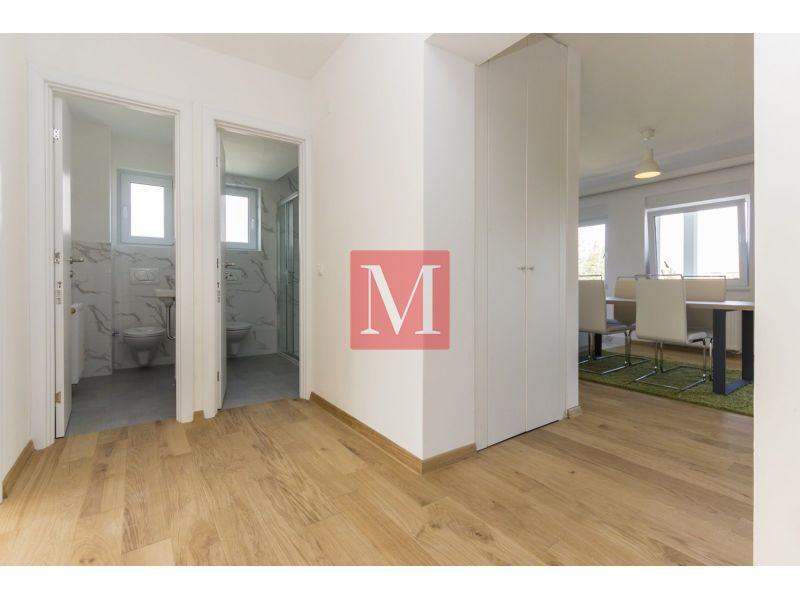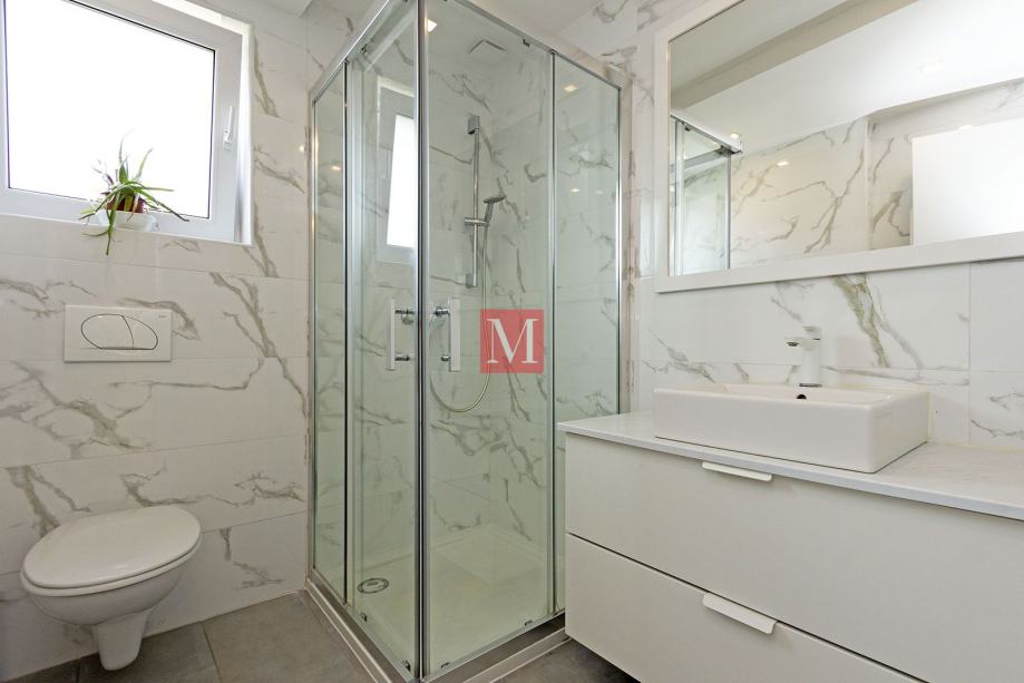 Sastoji od ulaznog hodnika, prostranog dnevnog boravka spojenog s kuhinjom i blagovaonicom te izlazom na terasu od 12m2, glavne spavaće sobe spojene sa još jednom sobom koja možeslužiti kao radna ili velika garderobna soba, 2. spavaće sobe, još jedne terase, kupaonice sa tušem i gostinjskog wc-a.