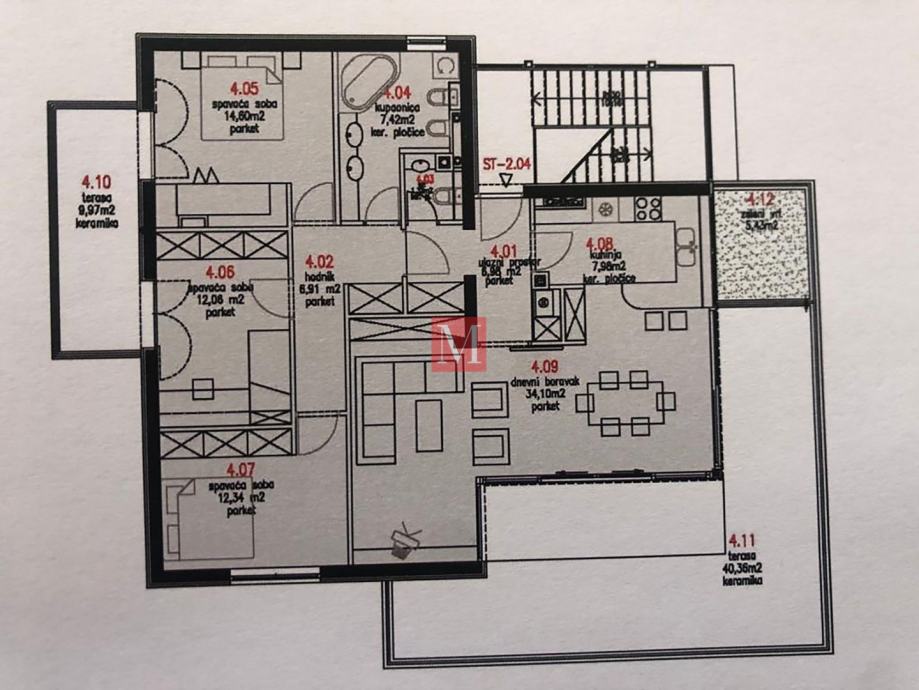 Sastoji se od ulaznog hola s garderobnim ormarima, kuhinje s blagovaonicom i dnevnim boravkom iz kojeg se izlazi na veliku terasu, 3 spavaće sobe, kupaonice s wc-om, gostinjskog wc-a i velikog balkona.