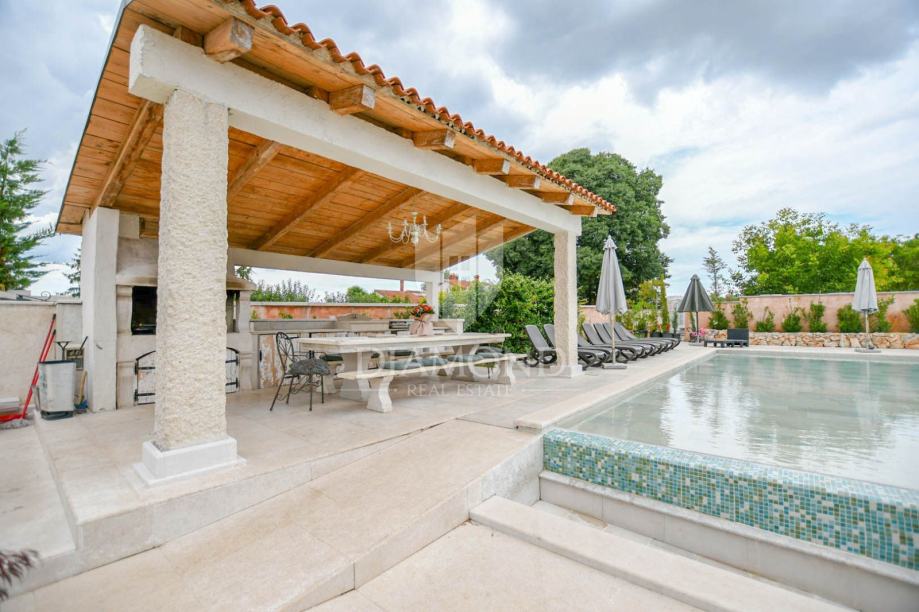 Na uređenoj okućnici nalazi se veliki bazen od 130 kvadratnih metara u tri nivoa sa slanom vodom. Vanjska kuhinja i roštilj sa garniturom za sjedenje, sigurno je mjesto za druženje u toplim ljetnim mjesecima.