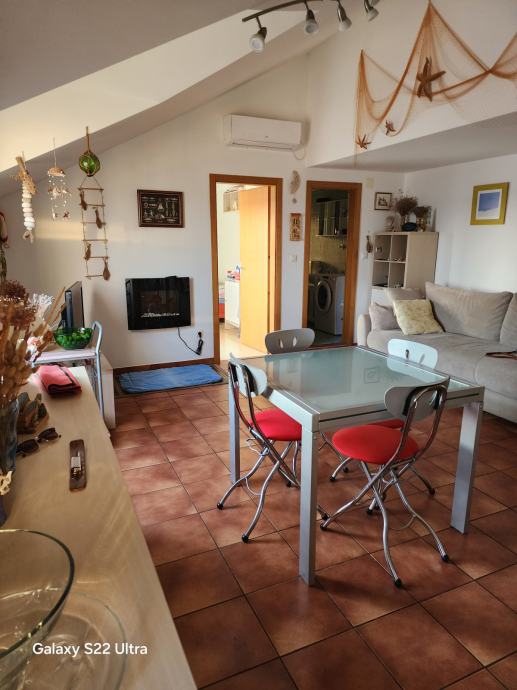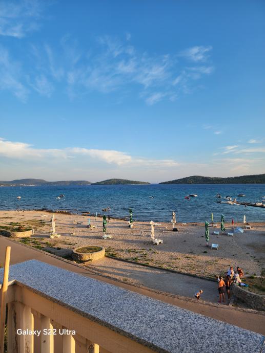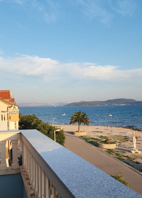 Na prodaju je lijep, potpuno namješten stan smješten na 2.ujedno i zadnjem katu manje stambene zgrade, na izuzetnoj lokaciji - prvi red do mora i plaže u Srimi kraj Vodica.