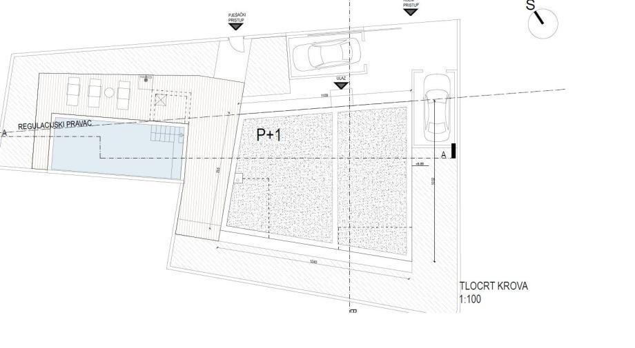 Srima, udaljeno 180 m od plaže, mirna lokacija, atraktivno građevinsko zemljište površine 404m2. Zemljište je ravno, ograđeno betonskim zidom sa tri strane, javna infrastruktura nalazi se neposredno uz zemljište. Zemljište ima izrađenu projektnu dokumentaciju te građevinsku dozvolu za izgradnju slobodnostojeće kuće (prizemlje + 1. kat) s ukupnom površinom od 158,38 m² te bazenom od 27,81 m².