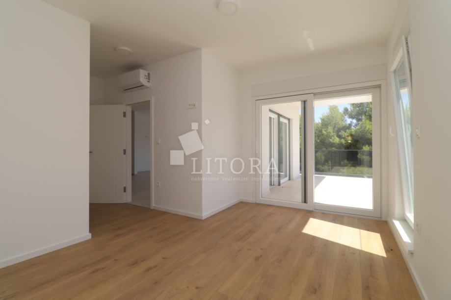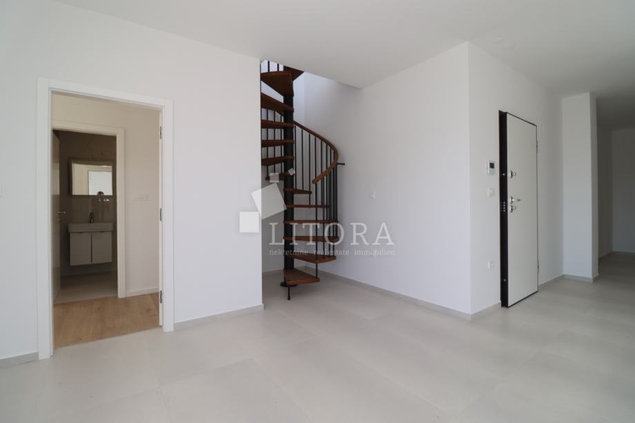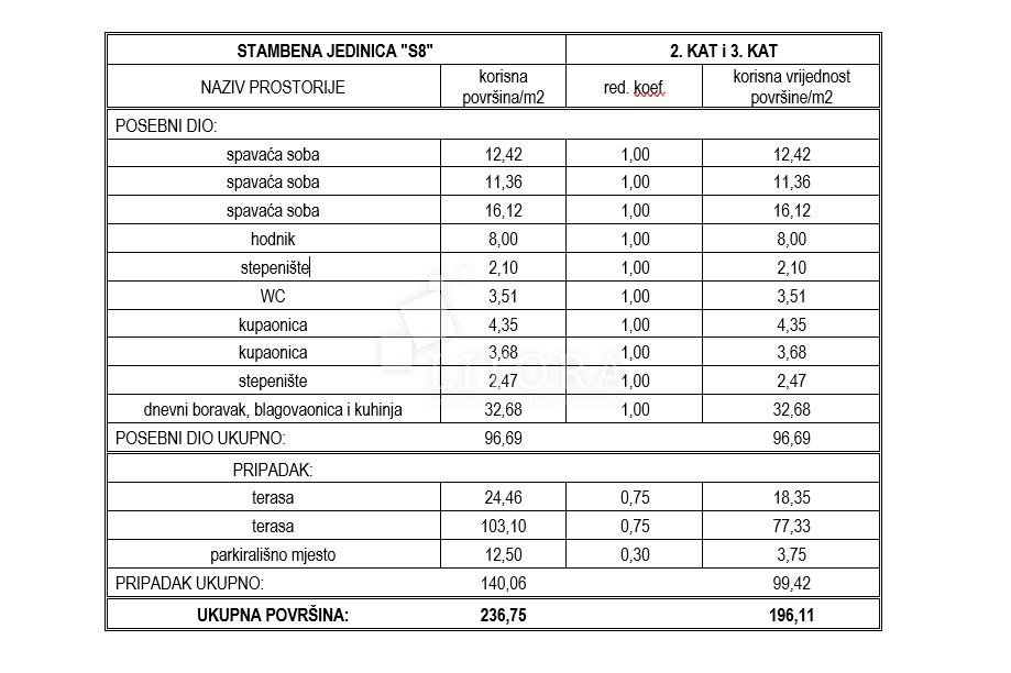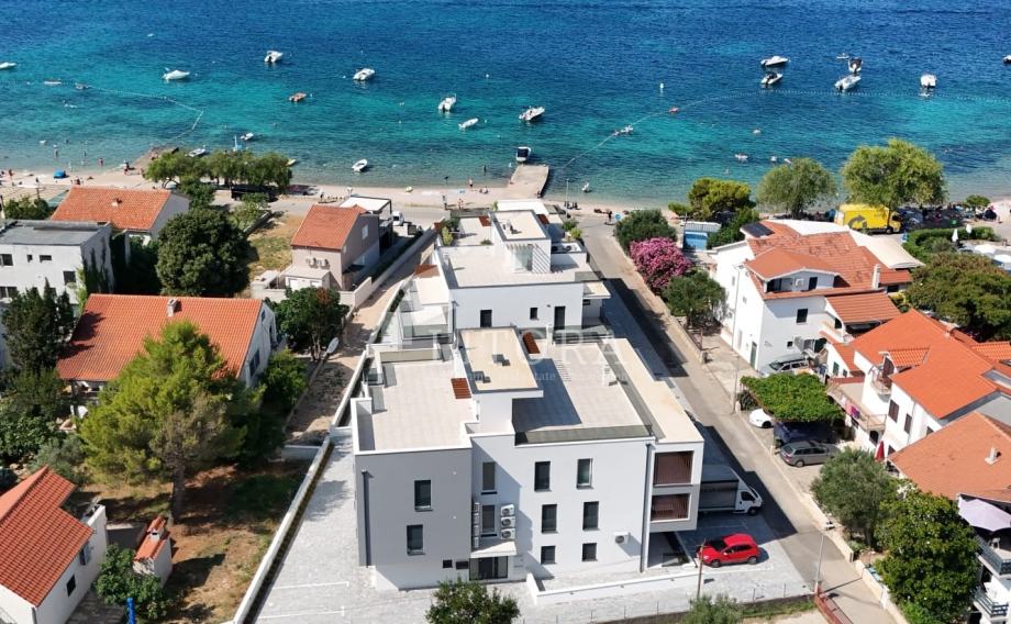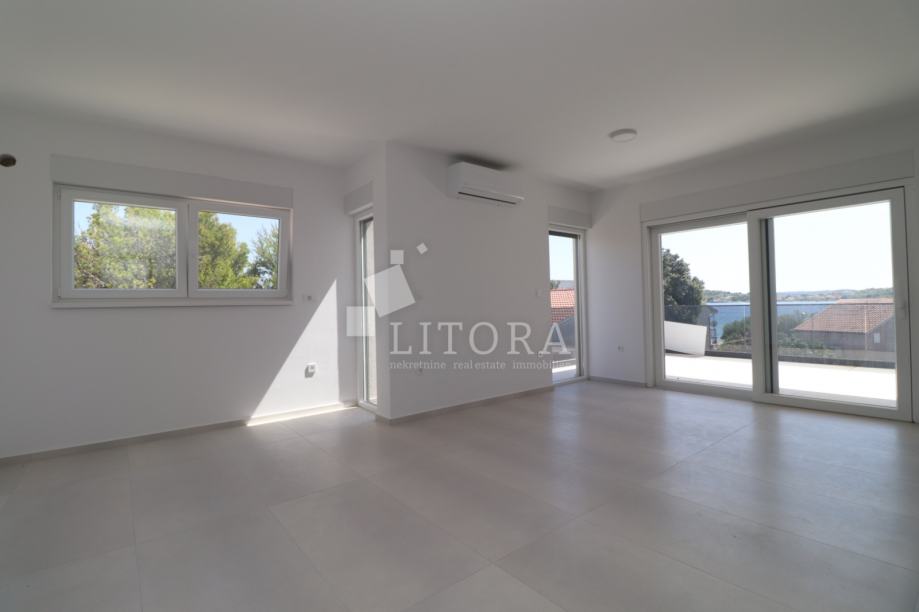Apartman se nalazi u novoizgrađenoj višestambenoj zgradi, smještenoj u drugom redu do mora. Ukupna korisna površina iznosi 196,11 m², a prostire se na drugom i trećem katu zgrade. Orijentiran je prema jugoistočnoj strani. Na donjoj etaži (2. kat) nalazi se predsoblje, gostinjski WC, hodnik, tri spavaće sobe, dvije kupaonice te prostrana kuhinja s blagovaonicom i dnevnim boravkom s izlazom na natkrivenu terasu površine 24,46 m² s pogledom na more. Iz dnevnog boravka spiralne stepenice vode na gornju etažu (3. kat), gdje se nalazi prostrana krovna terasa 103,10m2 s infrastrukturom, dodatnim gostinjskim WC-om i predivnim panoramskim pogledom na more, plažu i otok Prvić. Apartman je odmah useljiv i opremljen dimnjakom, podnim grijanjem u kupaonici, električnim podizačima roleta, komarnicima te termo izolacijskom fasadom. Apartmanu pripada jedno vanjsko parkirno mjesto.