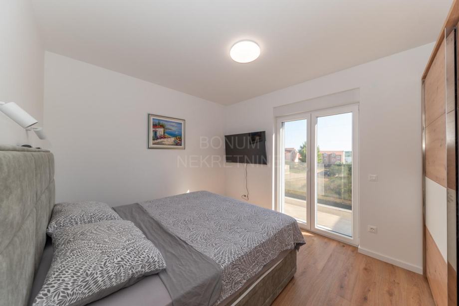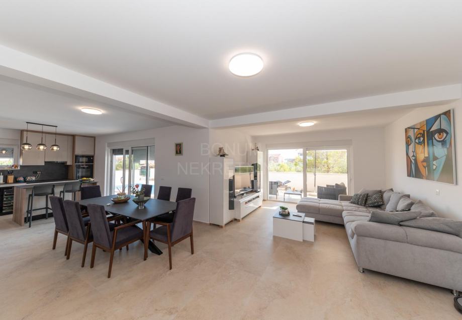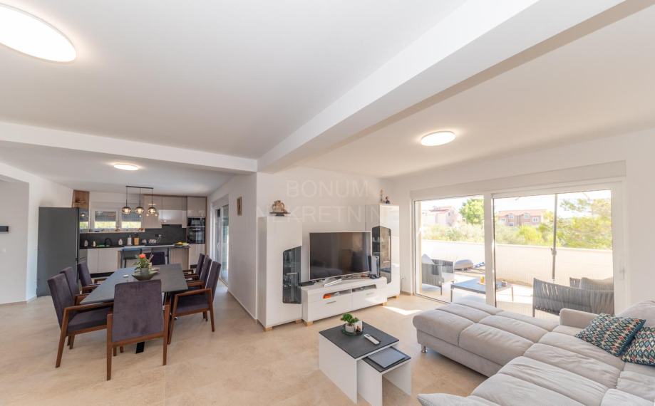 Prodaje se dvojna kuća sa bazenom na Srimi, Vodice. Kuća se nalazi na mirnoj lokaciji, u blizini plaže( 250 m). Sastoji se od prizemlja i kata. Ima odličan raspored. U prizemlju se nalazi ostava, toalet te dnevni dio sa kuhinjom i blagovaonom u jednoj cjelini. Iz dnevnog dijela i kuhinje su izlazi na natkrivene terase ispred kojih je sunčalište s bazenom te uređena okućnica. Unutarnjim stubištem se ide na prvi kat. Na katu su se nalaze tri spavaće sobe, od kojih jedna ima i vlastitu garderobu te kupaonu i terasu. Druge dvije spavaće sobe dijele drugu kupaonu te imaju zajednički balkon. Planirano useljenje je proljeće 2023 godine. U gradnje se koriste kvalitetni materijali te će kuća biti odlično opremljena( el. rolete s komarnicima, protuprovalna vrata, podno grijanje u kupaonama i toaletu, klime u svim sobama..) Kuća ima i vlastiti parking. Odlična nekretnina, idealna za boravak tijekom cijele kalendarske godine ali i za turistički najam.