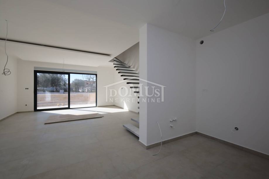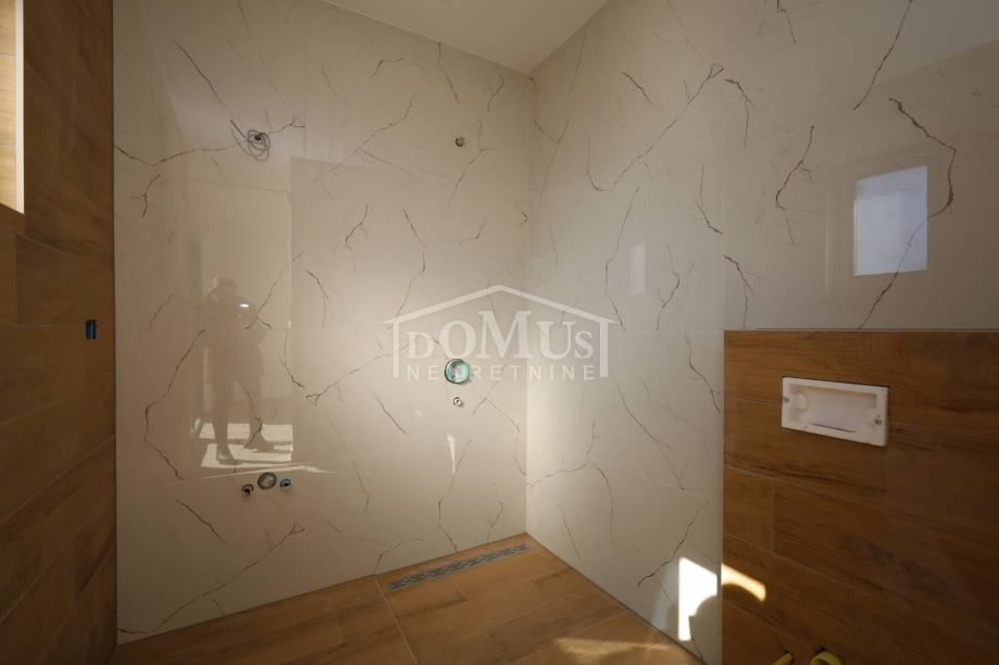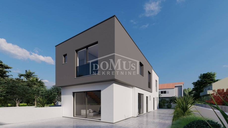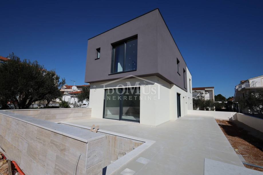 Srima, atraktivna lokacija, obiteljska kuća moderne arhitekture, udaljena 240m od šljunčane plaže. Kuća je dvojni objekt, na dvije etaže prizemlje + 1.kat. Kuća S1 (jugoistočna strana) ima sveukupnu korisnu površinu od 128,07m2 te pripadajuće dvorište od 105m2 s dva parkirna mjesta. Prizemlje se sastoji od ulaza / hodnika, Wc-a, ostave, kuhinje, velikog dnevnog boravka s blagovaonicom koja ima izlaz na terasu i u dvorište. Na 1. katu su smještene tri spavaće sobe, dvije kupaonice i spremište / praonica. Kuća je građena vrhunskim materijalima, opremljena protuprovalnim vratima, ALU podizno-kliznim stijenama s roletama na električno upravljanje, komarnicima, staklenim ogradama, električnim podnim grijanjem u kupaonicama kao i u kuhinji i dnevnom boravku, svaka prostorija s klima uređajem i TV/SAT priključkom. Grijanje tople vode je preko jednoga bojlera smještenog u spremištu, priprema za video nadzor za dvije vanjske kamere. Stepenice su konzole (lebdeće) čelične konstrukcije s drvenom oblogom i ogradom od čeličnih šipki u antracit boji. Bazen dimenzija 2,8m x 6.4m obložen keramičkim mozaik pločicama, a osim zelenog dijela dvorišta, okoliš i parking će biti popločani betonskim pločnikom. Predviđeno useljenje je proljeće 2025.g