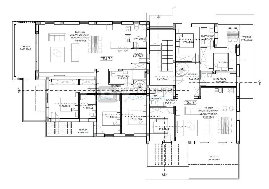 SJ 7 - kuhinja, dnevni boravak i blagovaonica open space koncepta (53,02 m2), tri spavaće sobe, dvije kupaonice, toalet, spremište, tri terase (25,22 m2+ 8,40 m2+ 62,48m2), parkirno mjesto