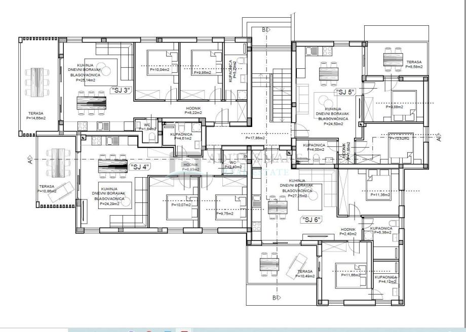 SJ8 - kuhinja, dnevni boravak i blagovaonica open space koncepta (34,75 m2), tri spavaće sobe, dvije kupaonice, toalet, spremište, tri terase ( 30,56 m2+ 17,82 m2+ 98,74 m2), parkirno mjesto