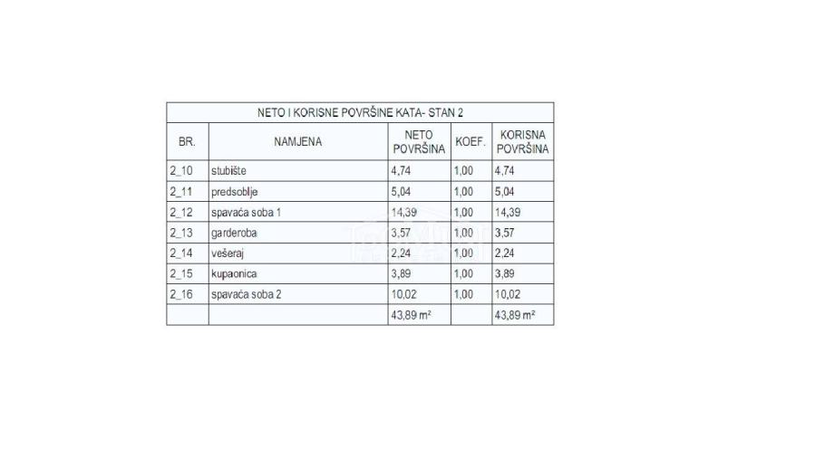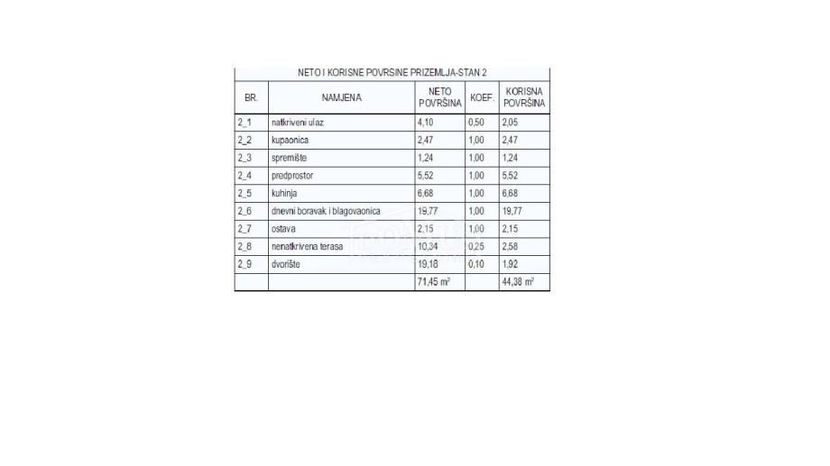 Prizemlje se sastoji od prostranog dnevnog boravka s kuhinjom i blagovaonicom, s izlazom na terasu površine 10,34m², kupaonice i spremišta, dok unutarnje stepenice vode na prvi kat gdje se nalaze hodnik, kupaonica, vešeraj, dvije spavaće sobe o od kojih jedna ima vlastitu garderobu.