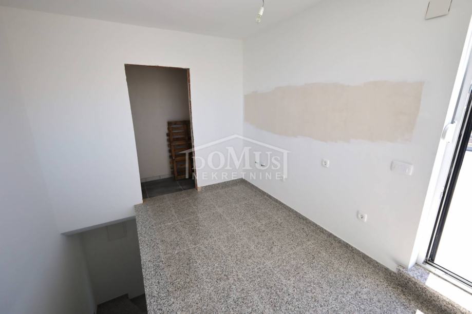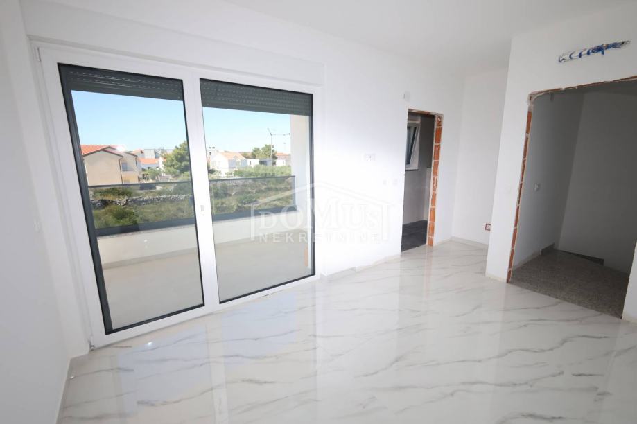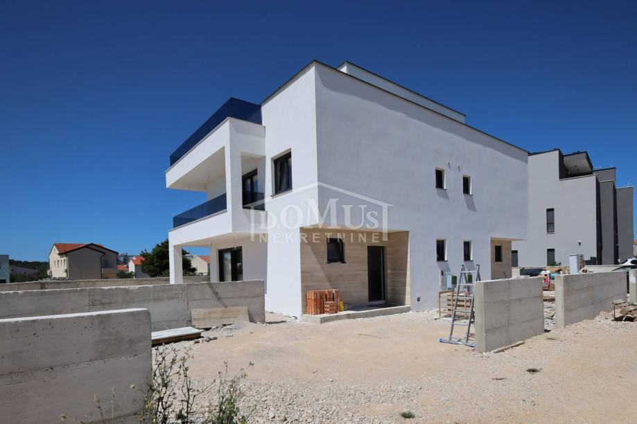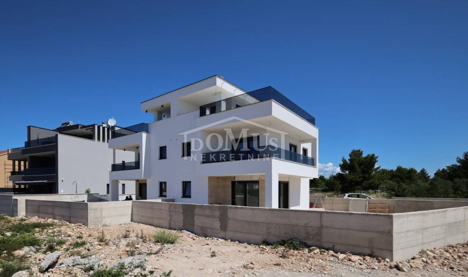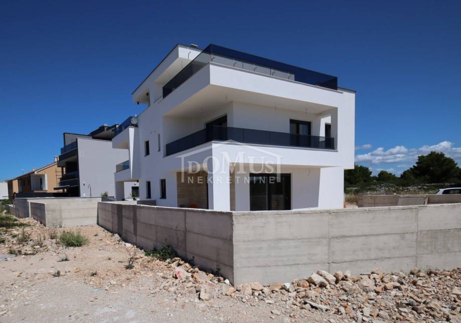 Obiteljska kuća na Srimi, udaljen samo 350m od šljunčane plaže i 700m od centra mjesta. Kuća je dvojni objekt, na tri etaže Prizemlje + 1.kat + 2.kat sa 153,41m2 sveukupne korisne površine te 200m2 okućnice sa velikom terasom, bazenom od 21m2 (3×7), te prostranim parkirnim prostorom. Prizemlje se sastoji od predsoblja, kupaonice, 2 ostave, velikog dnevnog boravaka s kuhinjom i blagovaonicom koja ima izlaz na terasu u izlaz u dvorište. Na 1. katu su smještene tri spavaće sobe, terasa, dvije kupaonice. Na 2. katu smještena je kotlovnica, mini kuhinju s izlazom na prostranu krovnu terasu koja ima 55m2, terasa je dijelom natkrivena, na krovnoj terasi je jakuzzi. Kuća će biti opremljena sa protuprovalnim vratima, ALU / PVC stolarijom sa roletama na električno upravljanje, staklena ograda, podno grijanje u cijeloj kući, svaka prostorija s klima uređajem, kamin. Okoliš će biti uređen sa mediteranskim biljem. Parkirni prostor popločan.