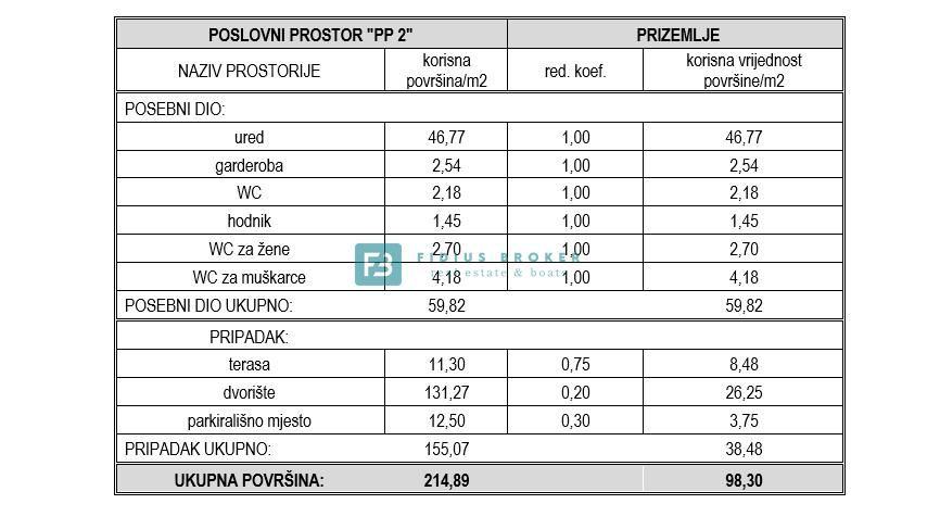 Nalazu se u prizemlju stambeno-poslovne zgrade, ukupne korisne površine s koeficijentima 196,44 m2, terase s prekrasnim pogledom, te posjeduju dva parkirna mjesta. Prostori su etažirani, po potrebi se mogu prenamijeniti u jedan veći poslovni prostor.