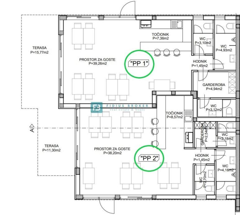 Poslovni prostor PP1 sastoji se od otvorenog prostora, garderobe, WC-a za osoblje, hodnika, WC-a za žene, WC-a za muškarce. PP2 sastoji se od otvorenog prostora, garderobe, WC-a za osoblje, hodnika, WC-a za žene, WC-a za muškarce. Prostori su prepuni svjetla i imaju predivan opuštajući pogled na more i arhipelag. Kompletno su uređeni.