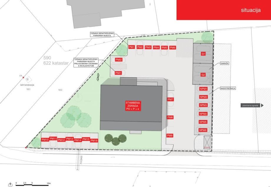 - Uz stambenu zgradu nalaze se 6 natkrivenih parkirnih mjesta, 18 nenatkrivenih parkirnih mjesta i četiri garažna mjesta (dvije garaže).