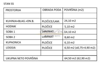 Stan S5 nalazi se na prvom katu te se sastoji od ulaznog prostora, kuhinje s blagovaonicom, dnevnog boravka, dvije spavaće sobe, kupaonice i loggie.