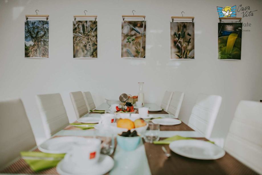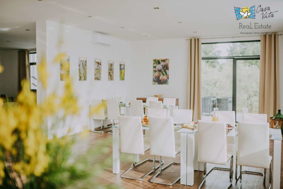Prizemlje od 140m2 sastoji se od ulaznog dijela i recepcije, jedne spavaće sobe s kupaonicom i izlazom na privatnu terasu, te dodatne prostorije i prostora za pripremu i posluživanje doručka.