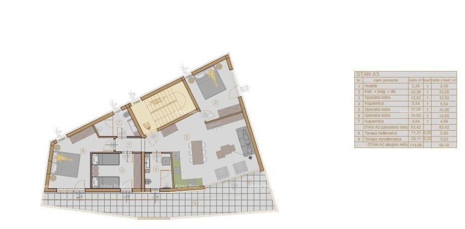 Stan A3, površine od 114.84 m2 (neto površine 94.10 m2) nalazi se na drugom katu zgrade A i sastoji od: hodnika, dnevnog boravka s kuhinjom i blagavaonom, 3 spavaće sobe, 2 kupaone i velike natkrivene i nenatkrivene terase.