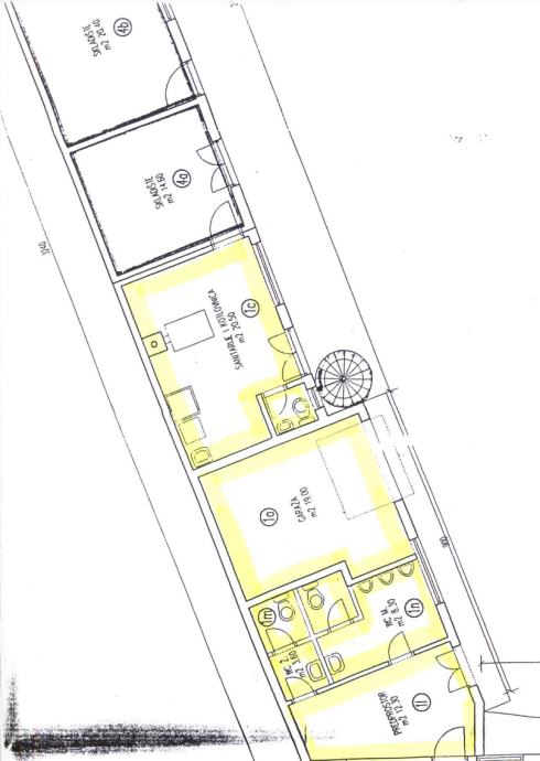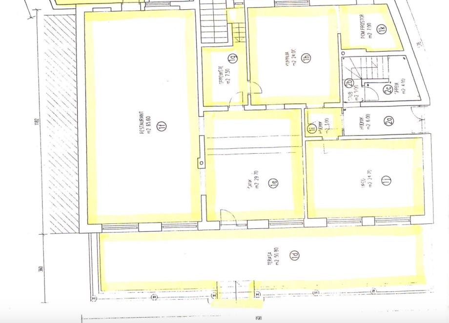 1. Poslovni dio: 341 m2 ( prizemlje + podrum ) visina prizemlja: 3,30 m.