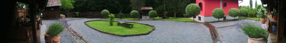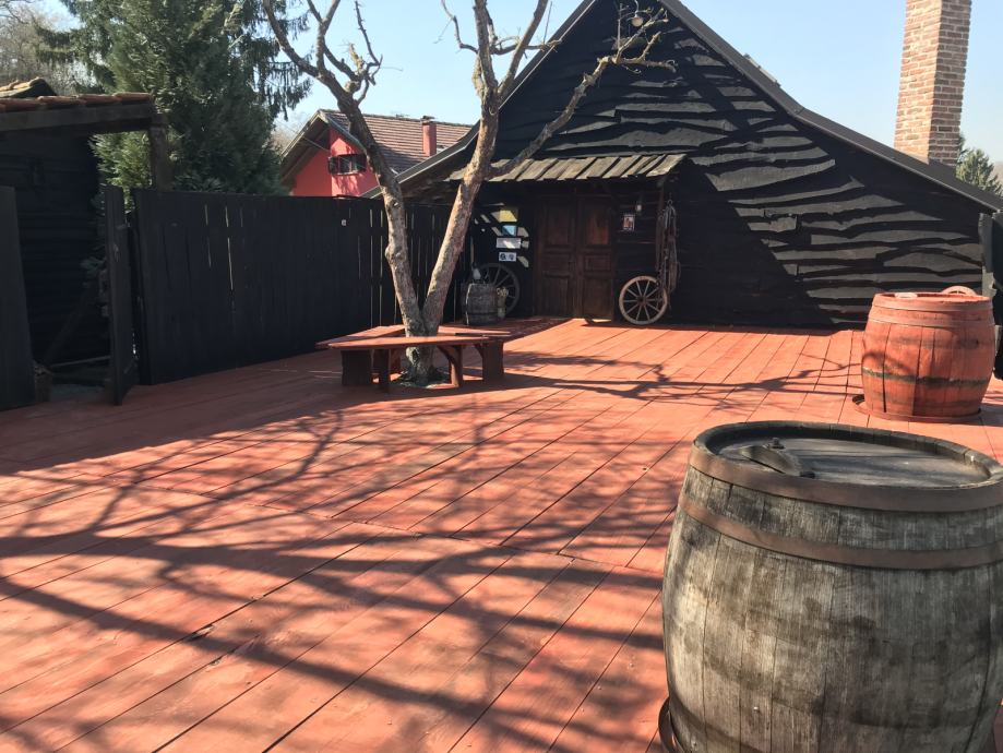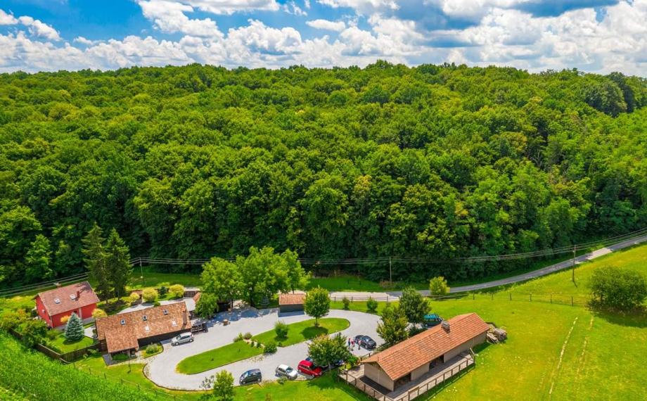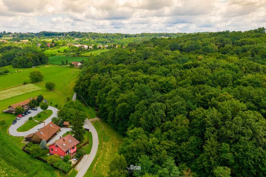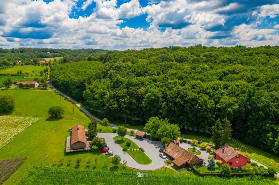 ETNO KUĆA(190m2 + velika nadstrešnica i terasa veličine 80m2)se sastoji od 6 prostorije vrlo atraktivnog izgleda uređene prirodnim materijalima, masivnom drvenom građom i opekama ručne izrade; prizemlje se nadovezuje na otvoreno potkrovlje namijenjeno raznim sadržajima. Velika kuhinja opremljena je za pružanje i pripreme hrane, skladište, kupaona(tuš) sa dva WC(muški, ženski), spavaća soba, prostorija za ured i male prezentacije,velika nadstrešnica s pogledom na uređeno dvorište i terasu u etno stilu. Centralni prostor uređen je mnoštvom masivnih hrastovim drvetom, a podna površina sa "seljačkim podom" puno drvo i atraktivnim unikatnim ručno rađenim otvorenim kaminom na drva. Uz kuću s istočne strane nalazi se parking za 30 vozila organiziran kružnim tokom.