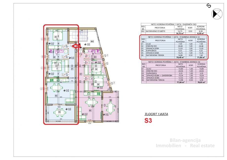 Stan oznake S3 se nalazi na prvom katu zgrade koja se sastoji od prizemlja i dva kata. Ukupno 6 stanova. Udaljenost od mora je 650 m.