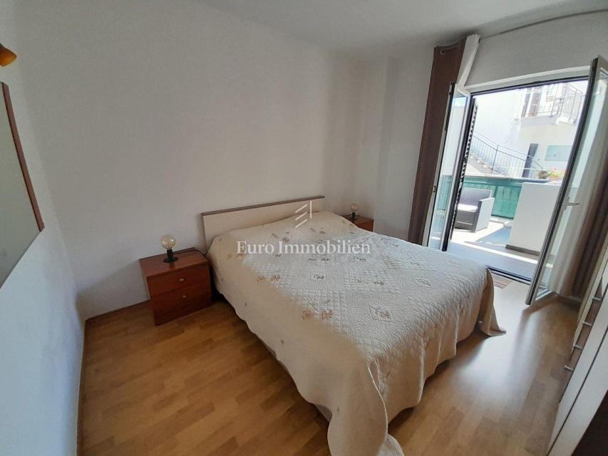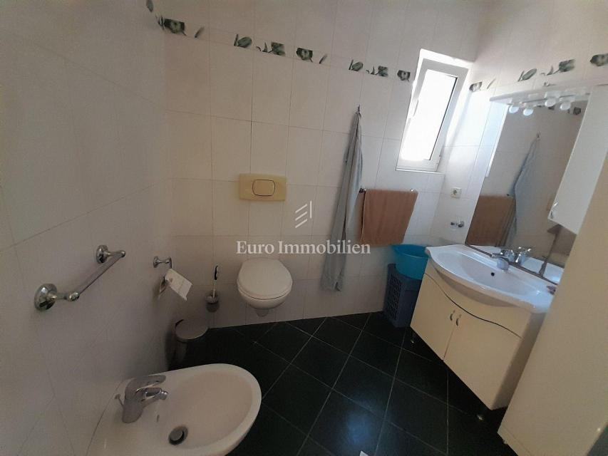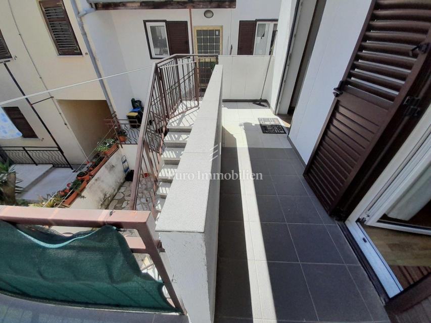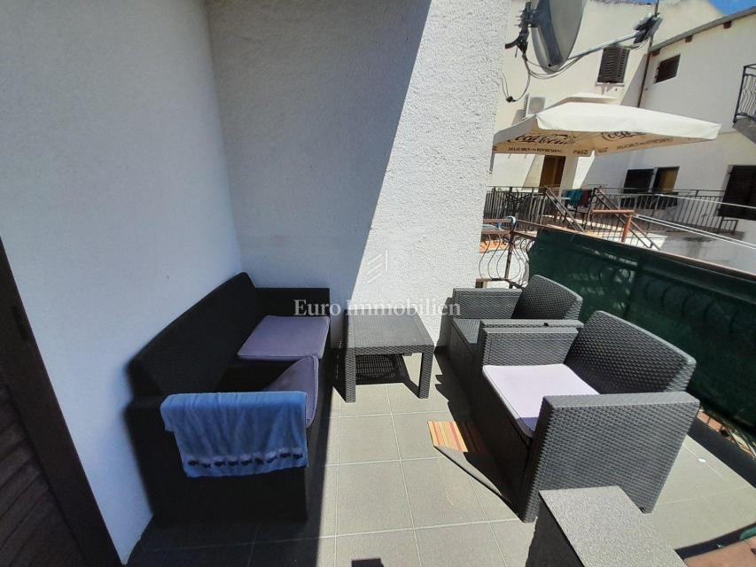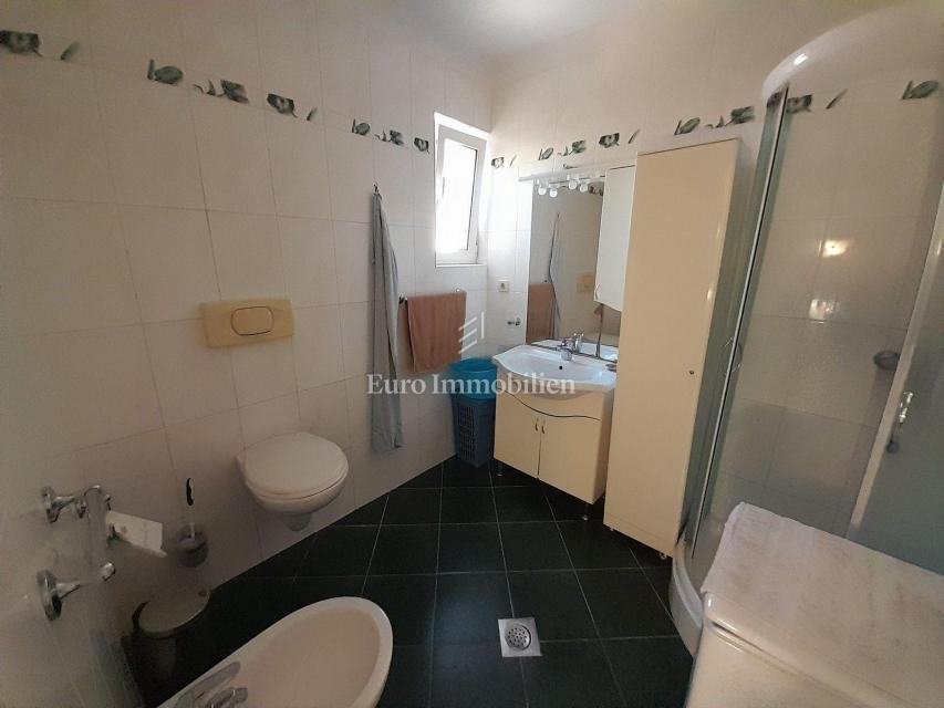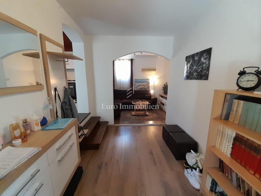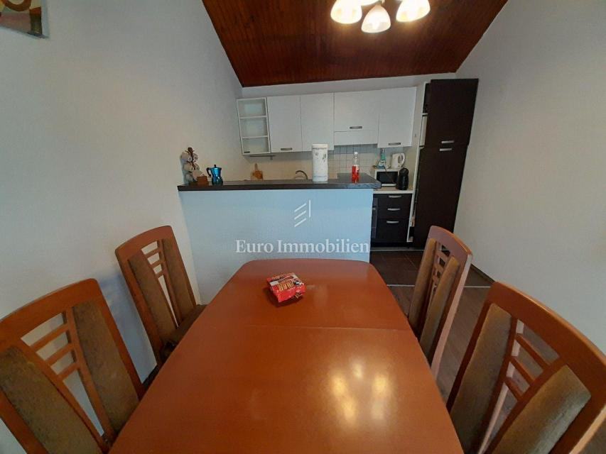 U kući se nalaze sveukupno dva stana. Stan se nalazi na prvom katu i sastoji se od hodnika, dnevnog boravka, prostrane blagavaone s kuhinjom te jedne spavaće sobe i kupaonice. Terasa se nalazi s lijeve strane ulaza u stan, terasa je vratima povezana sa spavaćom sobom. Dobra investicija za život ili turistički najam.