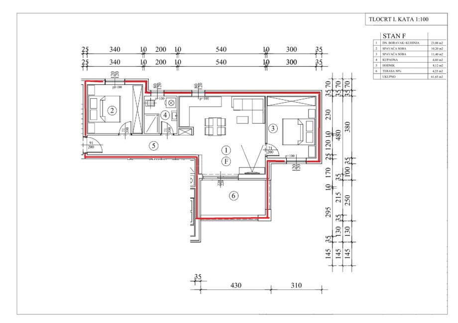Površine je od 61.65 m2, te se sastoji od dvije spavaće sobe, dnevnog boravka s kuhinjom i blagovaonicom, kupaonice te lođe.