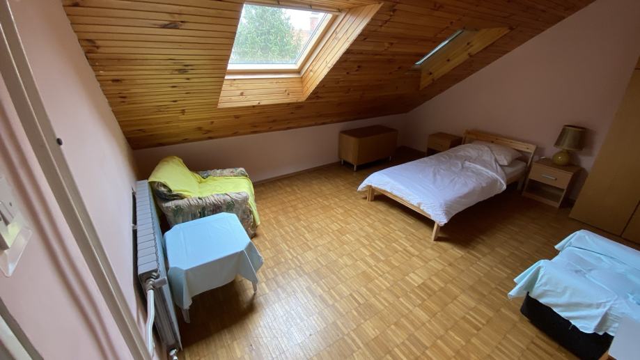 Unutarnje stepenice vode na gornju etažu (visoko potkrovlje) gdje su još dvije sobe, kupaonica sa WC-om i loggiom.
