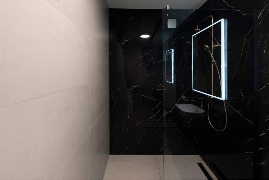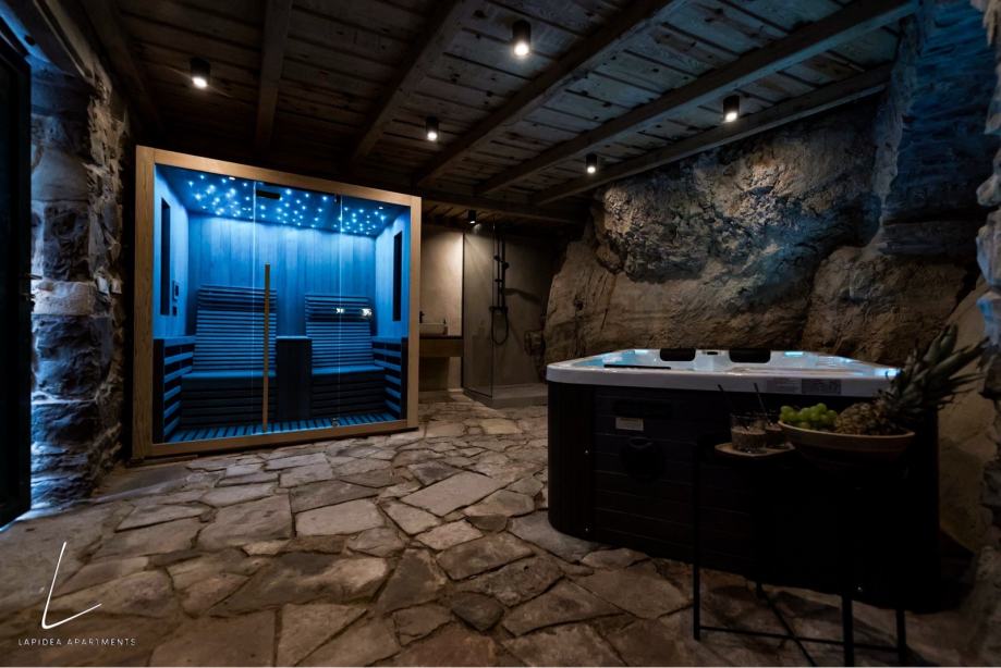 Ispod terase nalazi se tzv. spa prostorija s jacuzzijem, saunom, tušom i umivaonikom koja je posebna po kamenom podu i živoj stijeni.