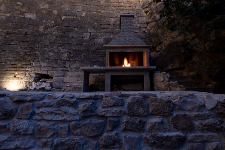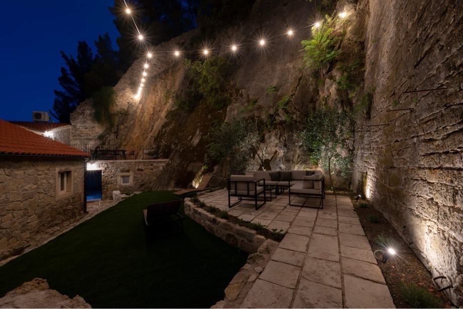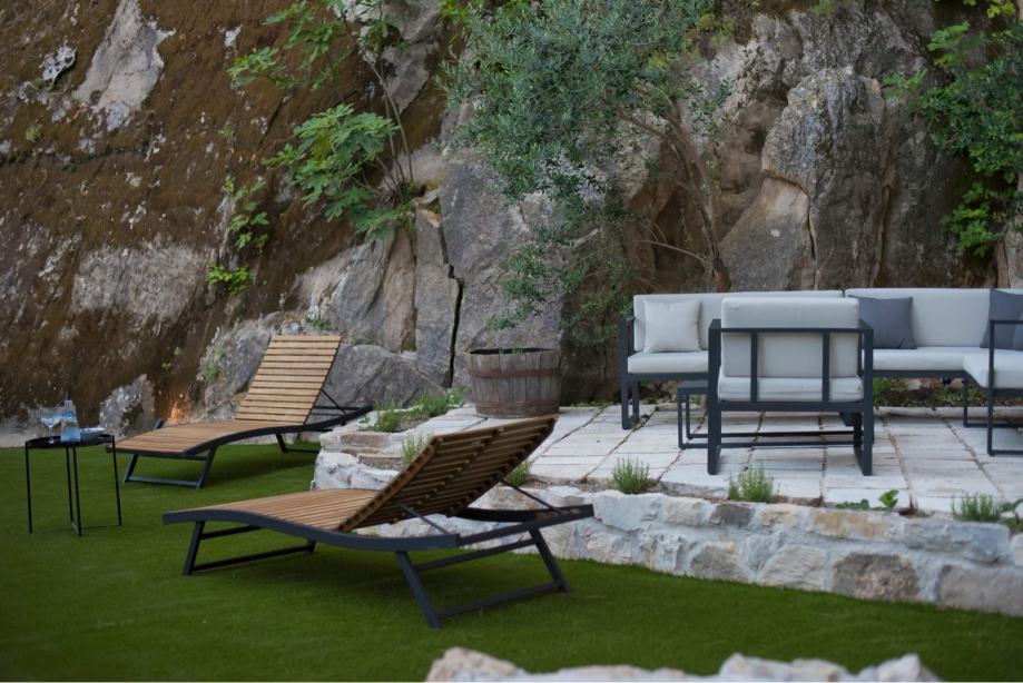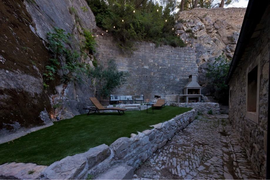 Na prostranu terasu s otvorenim pogledom izlazi se iz dijela kuhinje. Terasa je opremljena velikim stolom za sjedenje s pogledom na dvorište okruženo stijenama. U dvorištu se nalazi mediteransko bilje koje krasi okućnicu i vrt, popločana terasa sa sjedećom garniturom te kameni roštilj.