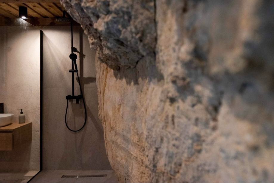 Below the terrace is the so-called spa room with a jacuzzi, sauna, shower, and sink, which is special due to its stone floor and living rock.