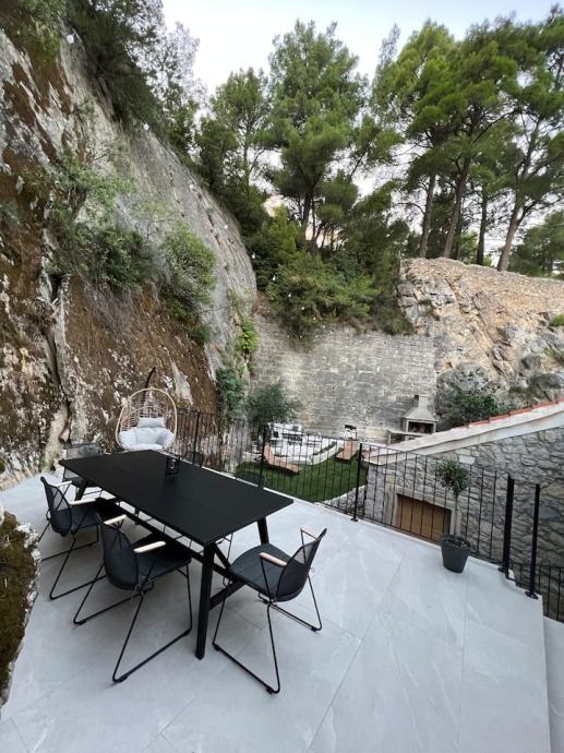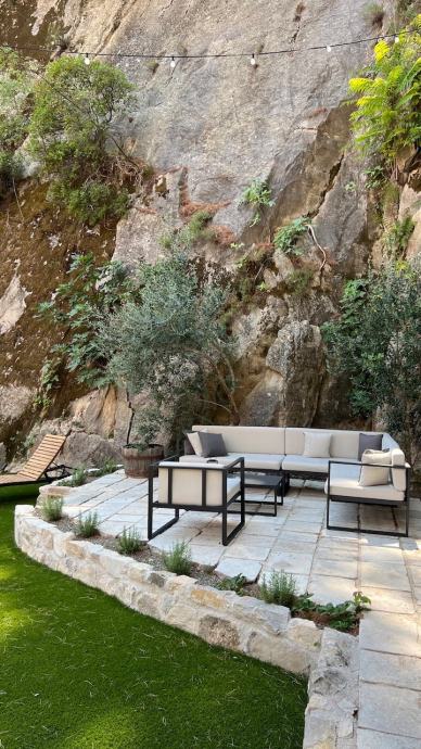 A spacious terrace with an open view is accessible from the kitchen area. The terrace is equipped with a large dining table, offering a view of the courtyard surrounded by rocks. The garden features Mediterranean plants that adorn the yard and garden, a paved terrace with seating, and a stone barbecue.